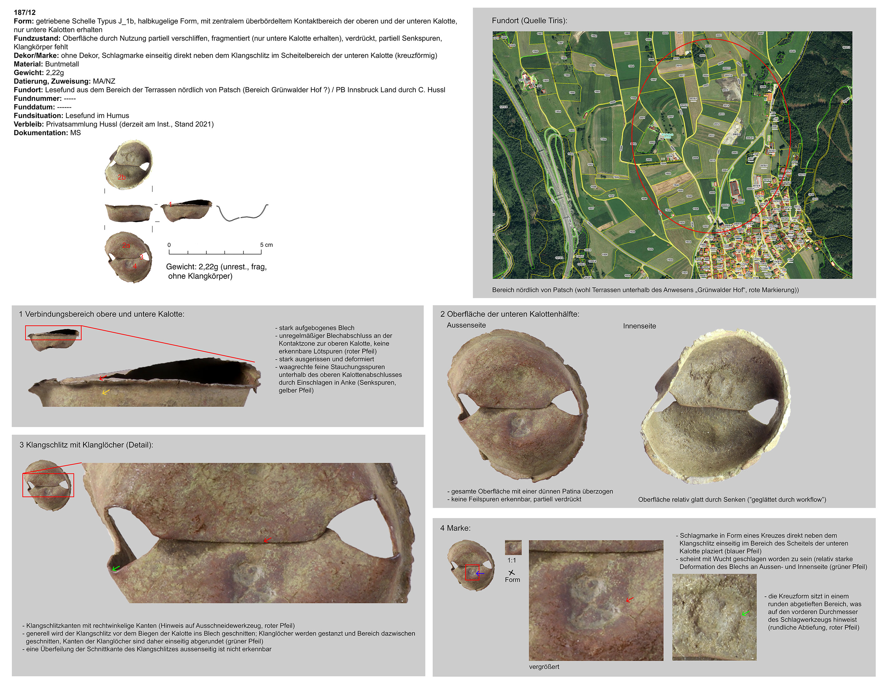 | 187/12 | fragmentiert | nicht erhalten | Patsch, Felder (Ch. Hussl) | Mittellage/Humus (Lesefund) | kreuzförmige Marke direkt neben dem Klangschlitz |