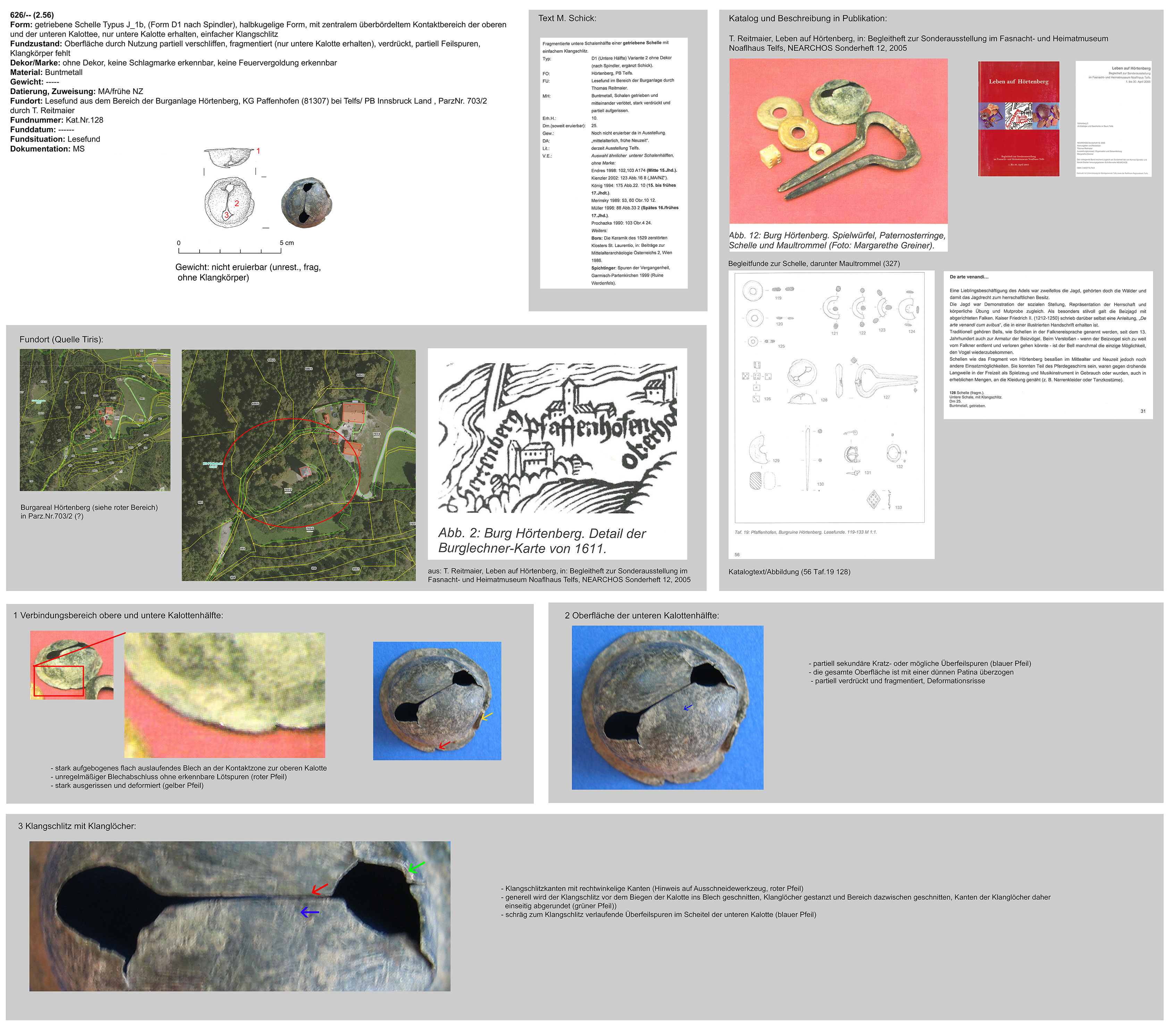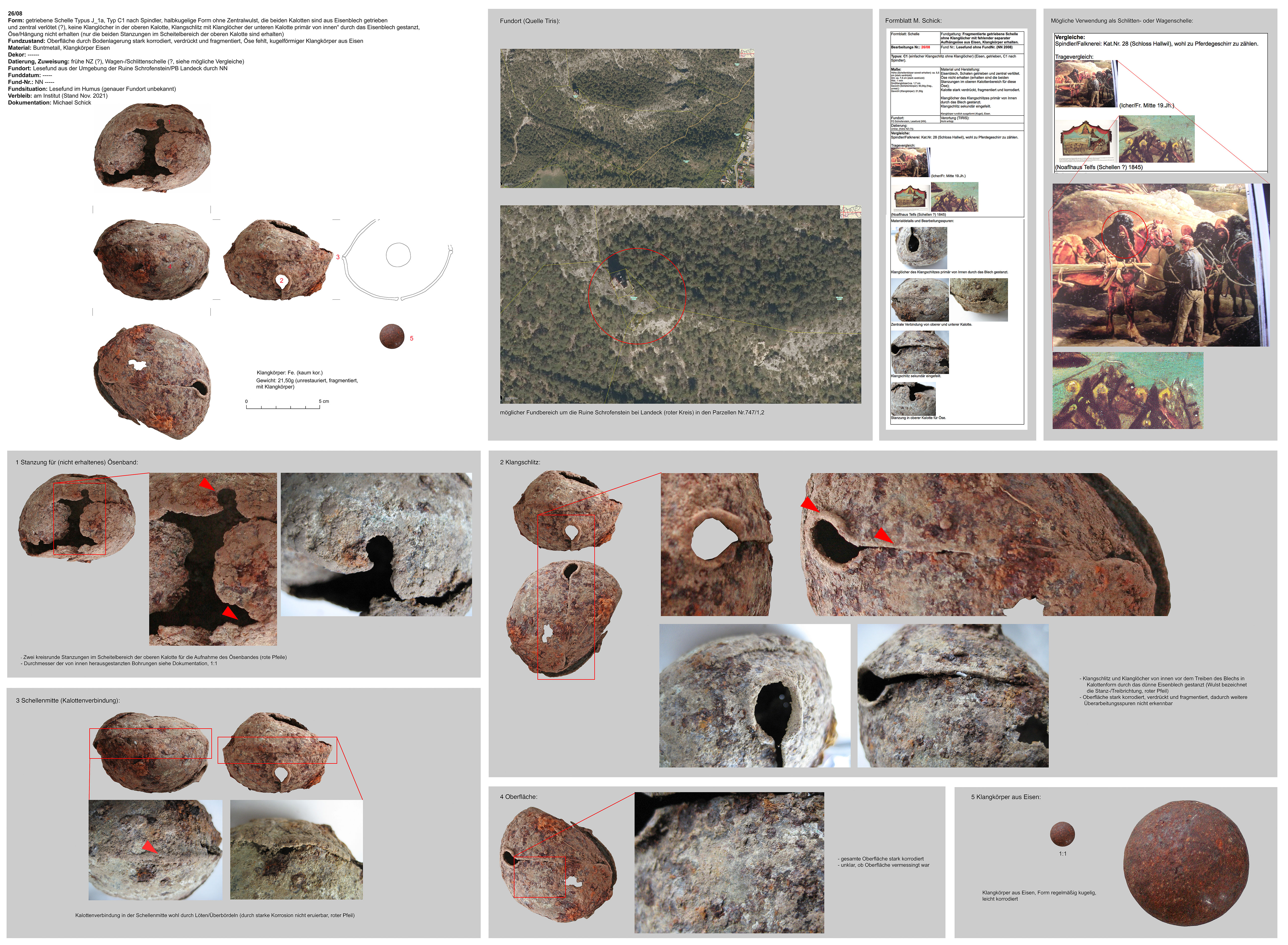 | 26/08 (fragmentiert) | zweiteilig (2 Kalotten), kugelig, zentraler Bereich möglicherweise überbördelt, mögliche Schlitten- oder Wagenschelle | Eisen | Burgruine Schrofenstein, PB Landeck (NN) | unklar, wohl Mittellage bei Burgruine (Lesefund) | ohne |