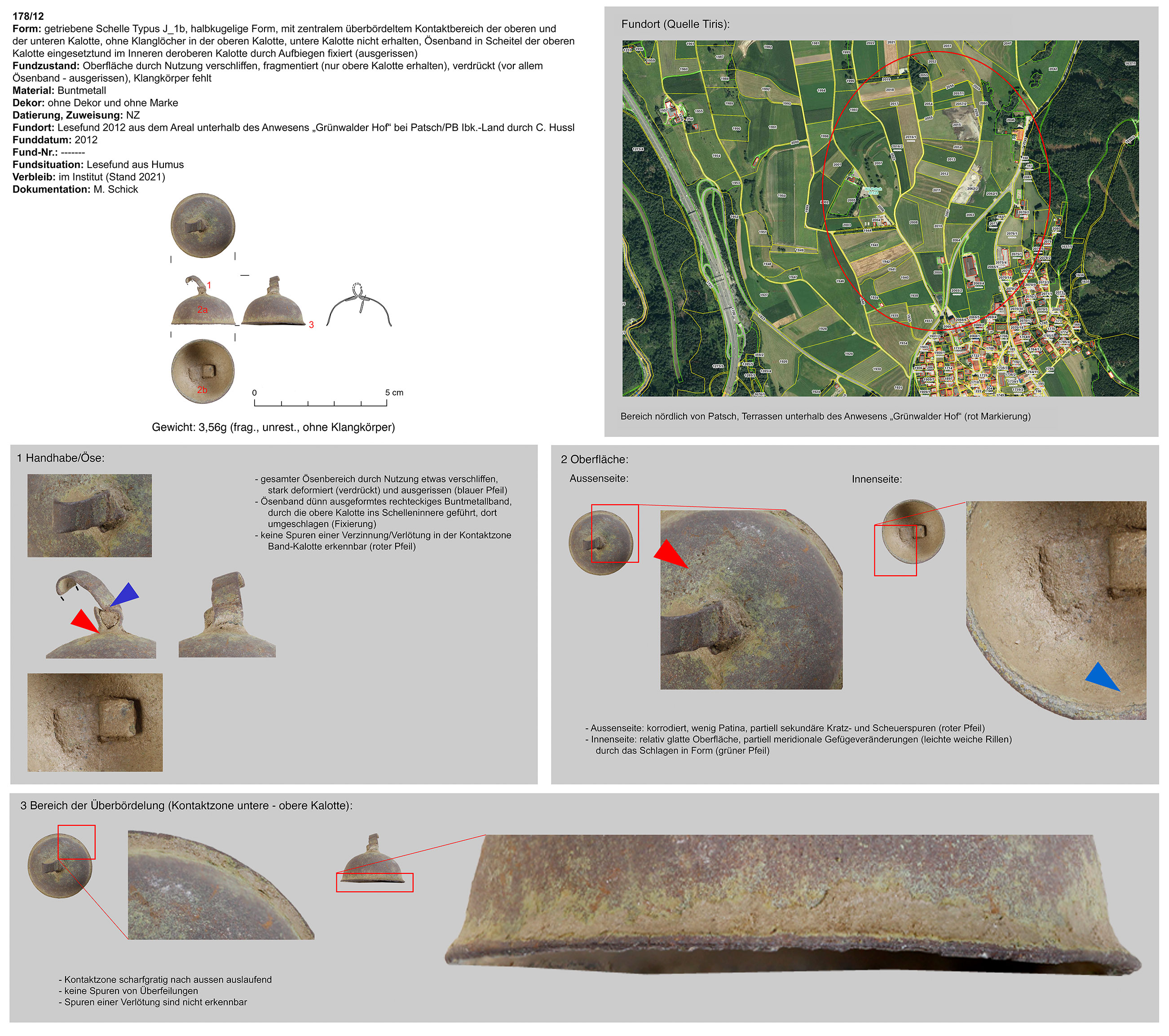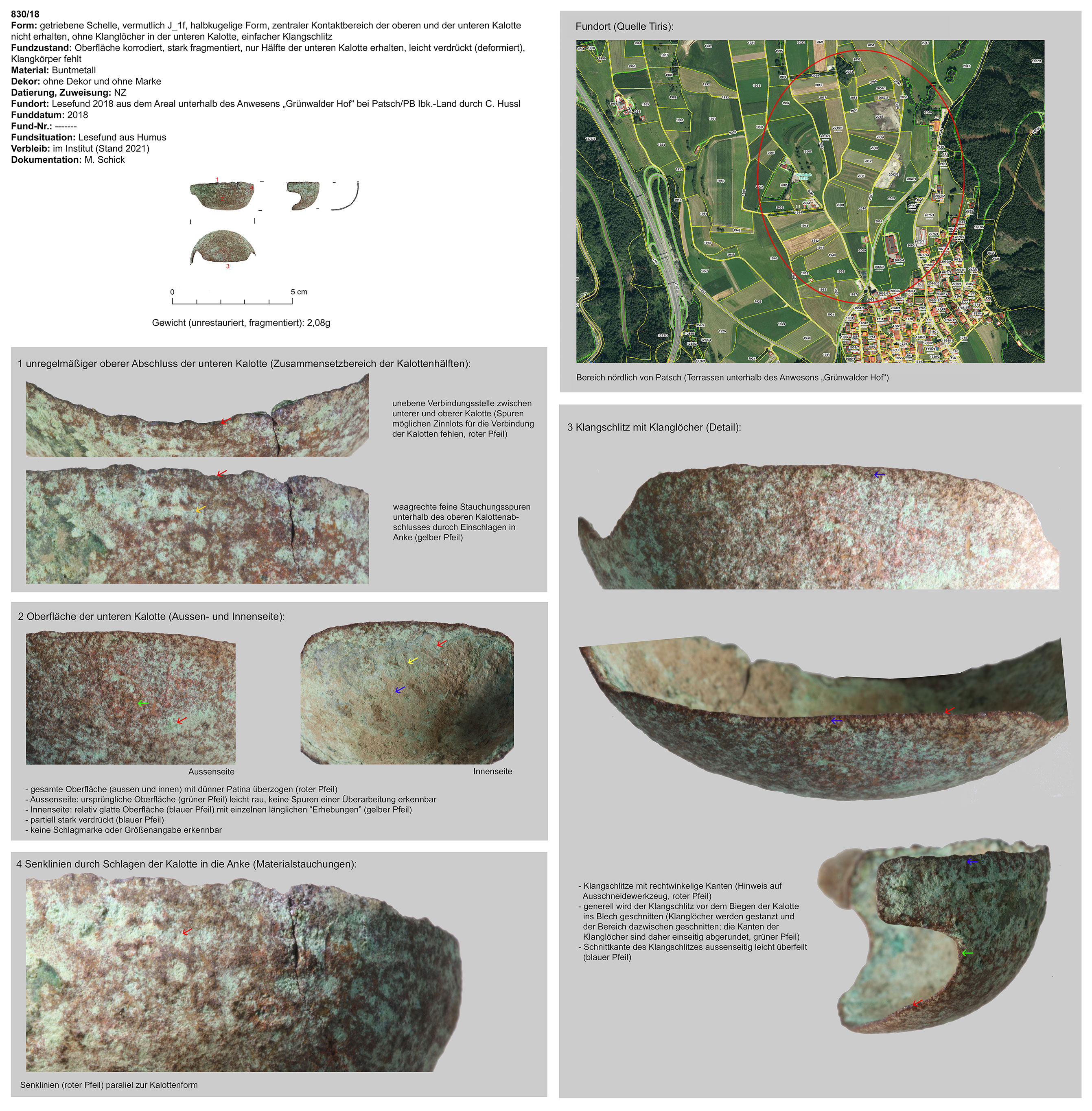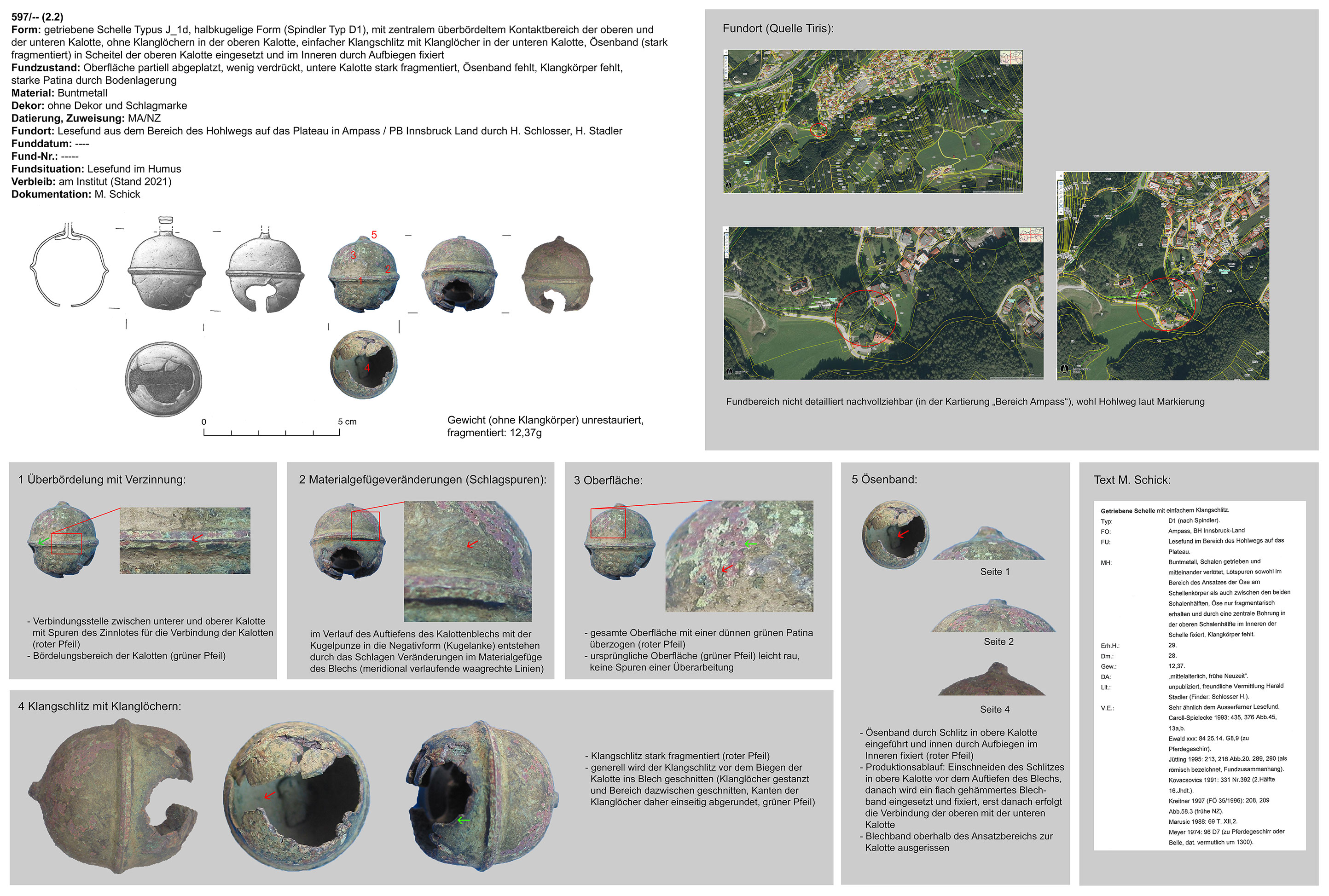 | 194/12 | zweiteilig (Kalotte mit Hängevorrichtung), ohne Wulst, quadratisch, gestaucht, kreuzförmiger Klangschlitz (gefaltet), Funktion unklar | vermutlich kleiner runder Stein | Patsch Umgebung (Ch. Hussl) | Mittellage/Humus (Lesefund) | ohne |
