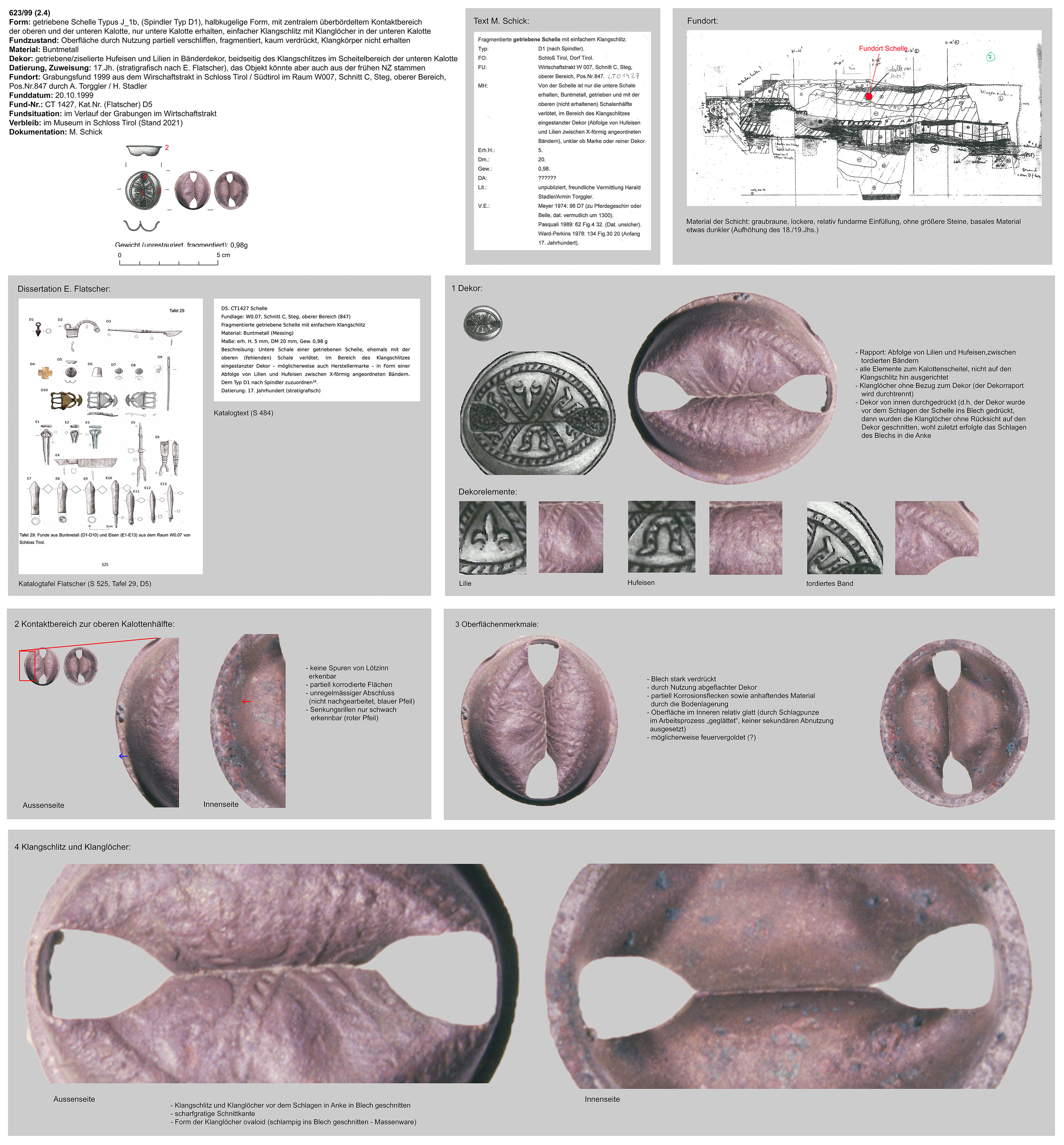 | 757/17 | halbkugelig, zweiteilig, zentraler Wulst, Funktion unklar (Belle ?) | nicht erhalten | Schloss Sigmundskron, I-Bozen (G. Ritzi) | Mittellage/Burgareal (Grabungsfund) | Gravuren in unterer Kalotte (vergleichbar mit denen auf Schelle 69/09 aus Schloss Lengberg) |
