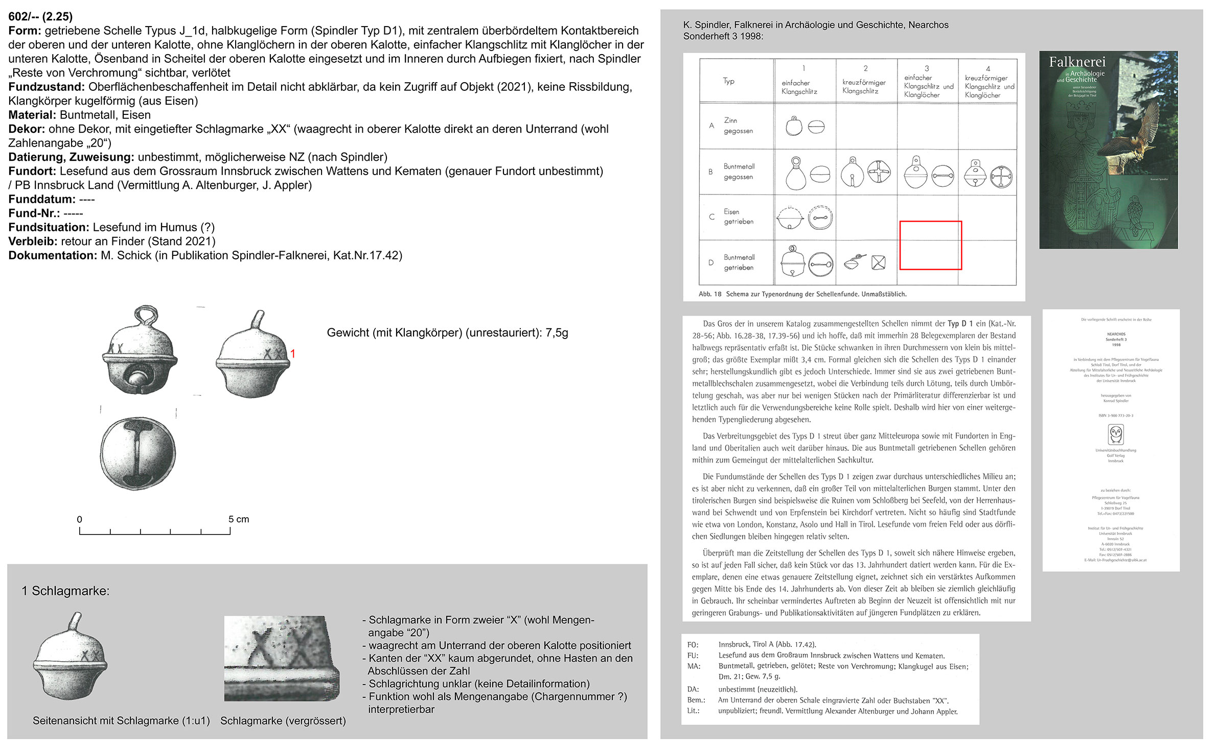 | 602/00 (2.25) | zweiteilig (2 Kalotten), halbkugelig, zentraler Bereich überbördelt (verzinnt?), Verbindungsbereich abgerundet | kugelförmig, Eisen | Großraum Ibk zwischen Wattens und Kematen | Tallage (Lesefund) | zwei „XX“ in oberer Kalotte waagrecht direkt über Unterrand |