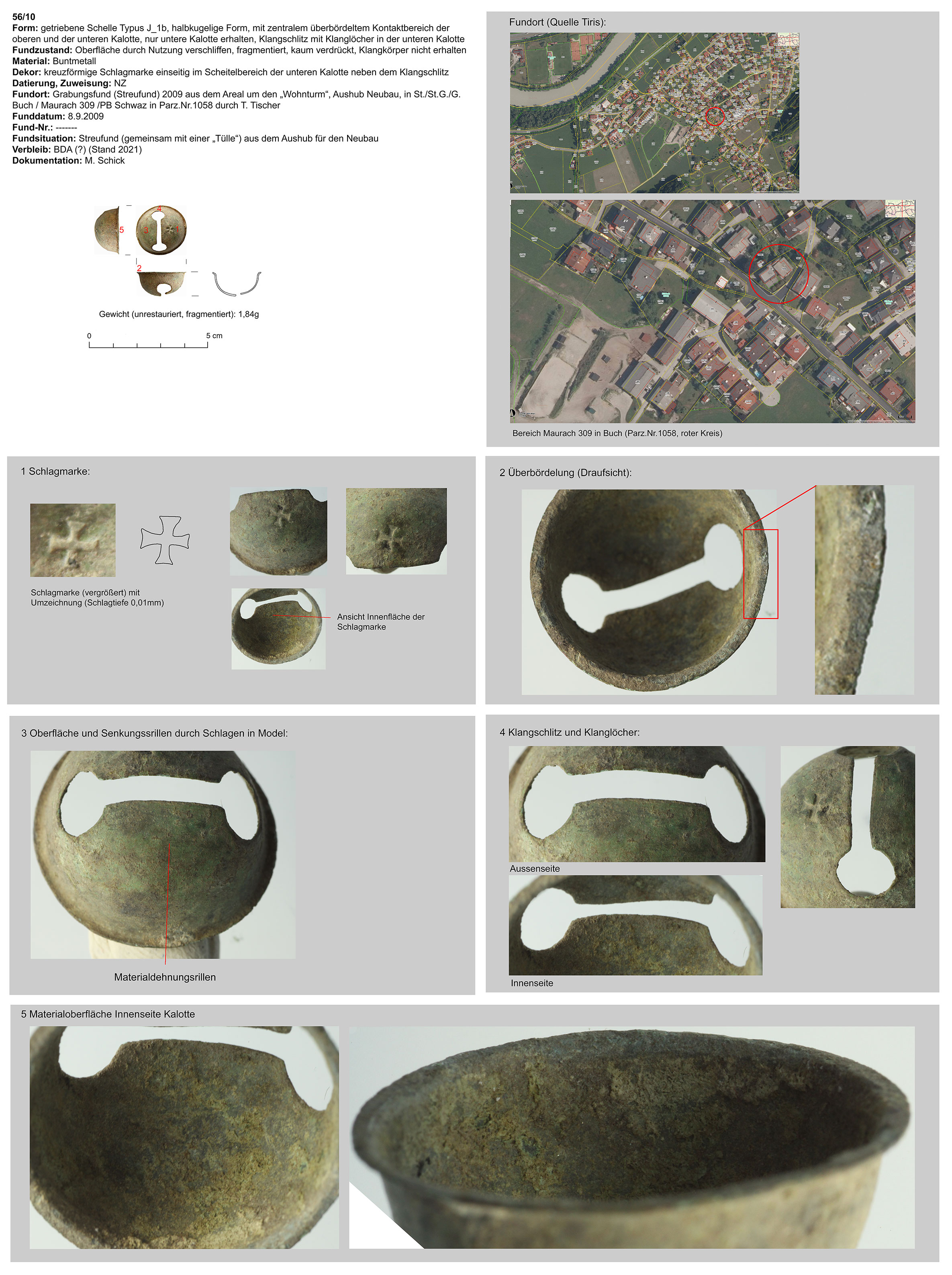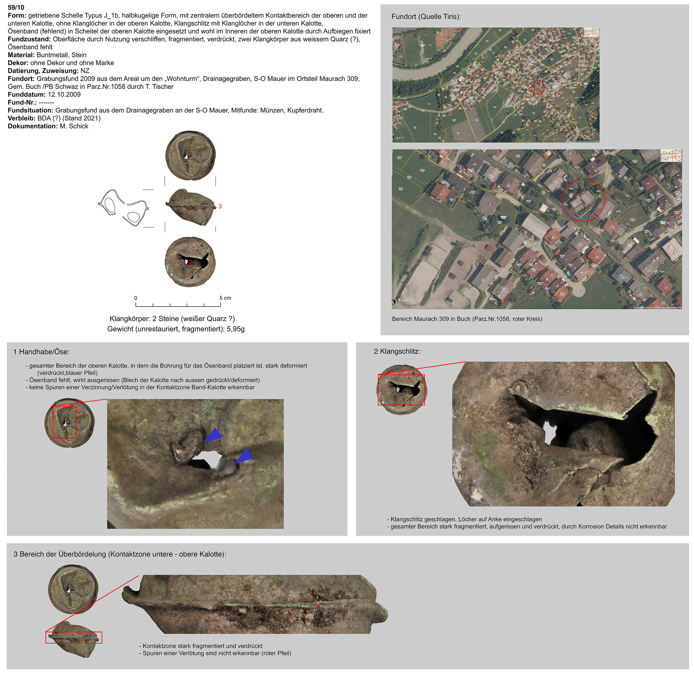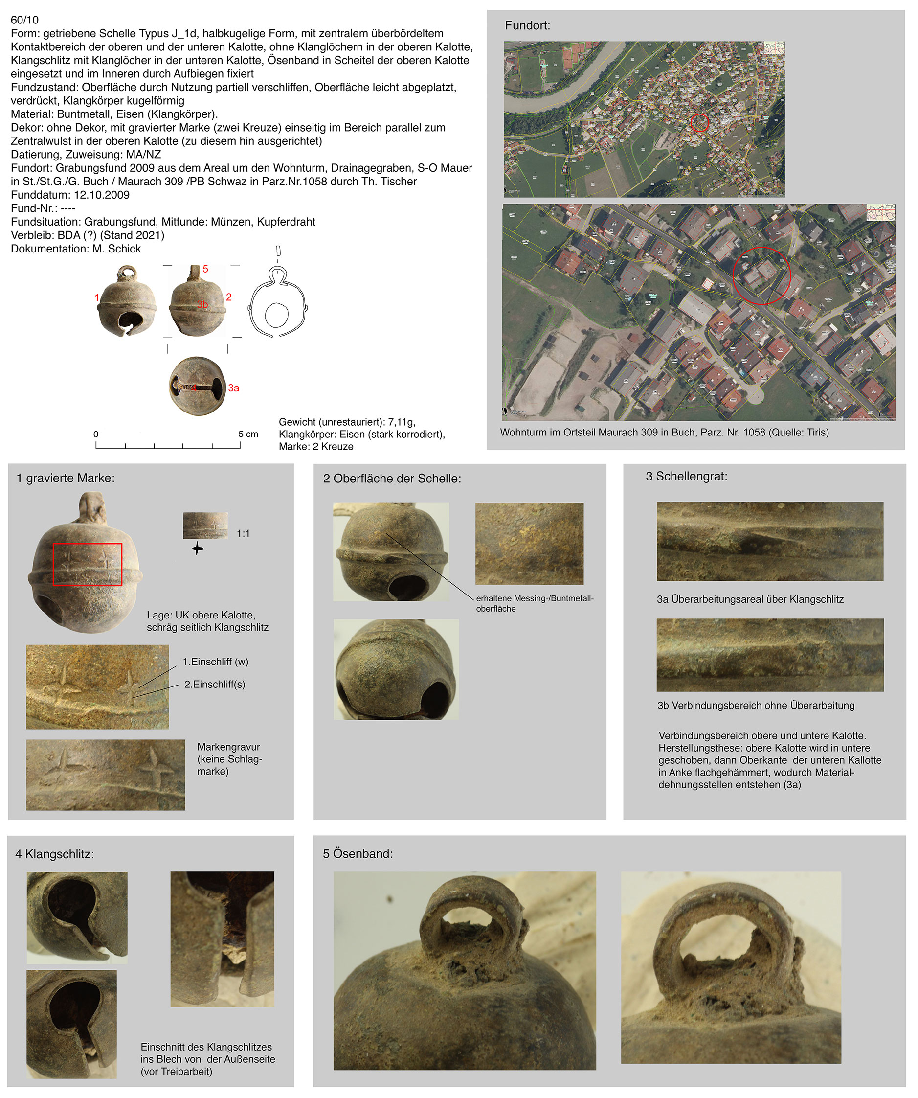 | 60/10 | zweiteilig (2 Kalotten), halbkugelig, zentraler Bereich überbördelt (verzinnt?), Verbindungsbereich abgerundet | kugelig, Eisen | Ortsteil Maurach, Buch, Wohnturm, Drainagegraben, S-O Mauer (Th. Tischer) | Tallage/Siedlungsgebiet (Grabungsfund) | Marke: 2 Kreuze in oberer Kalotte direkt an Überbördelungsbereich |