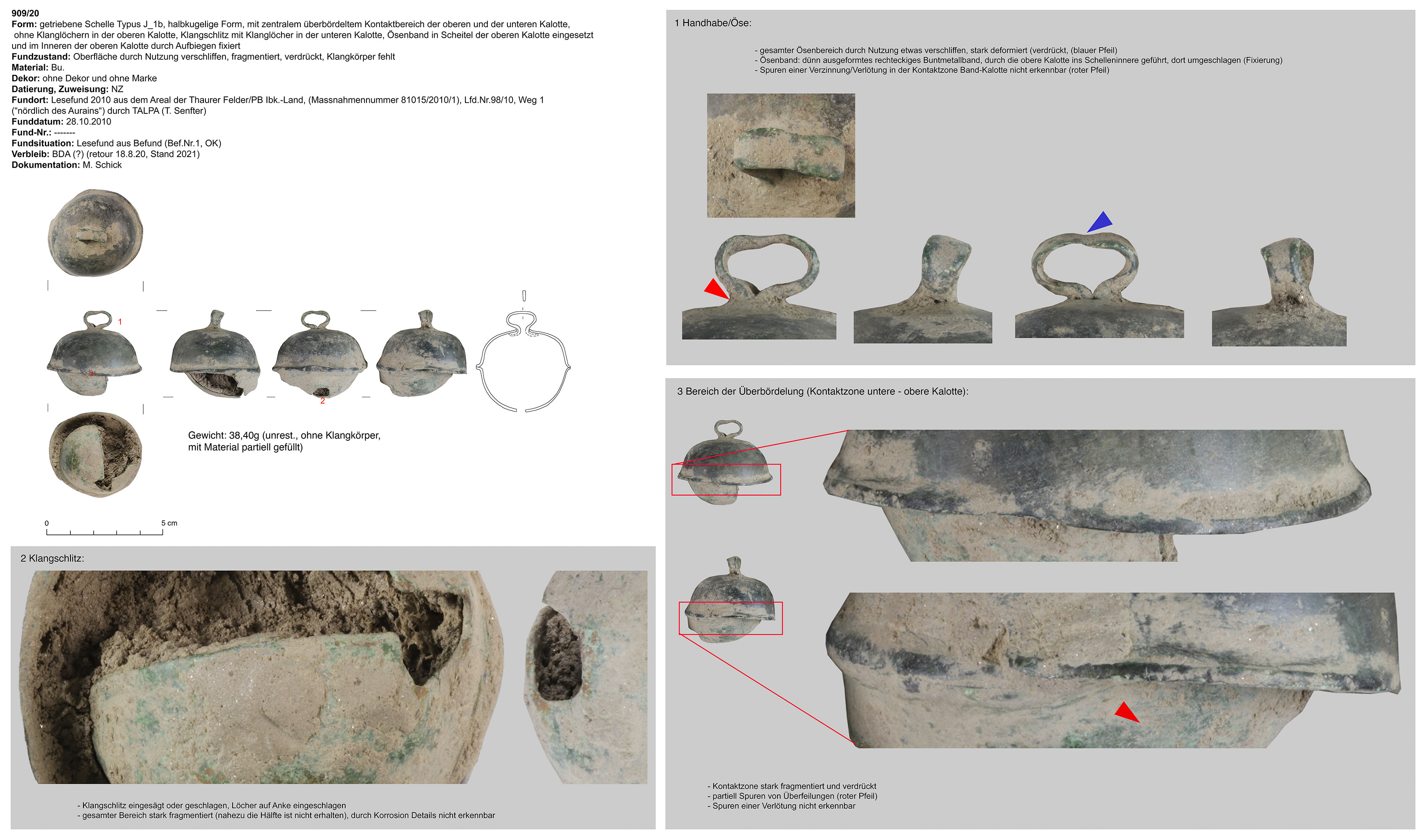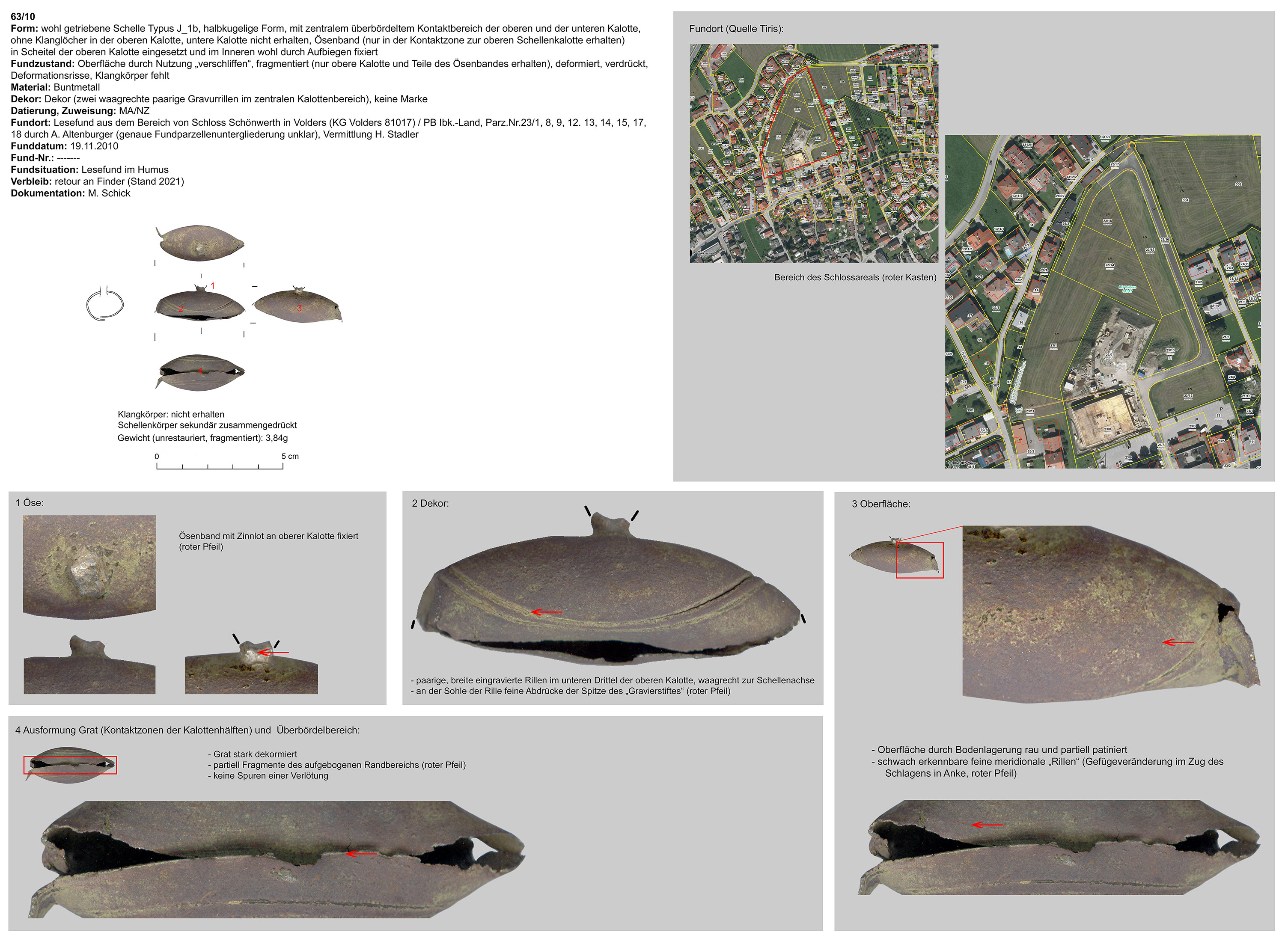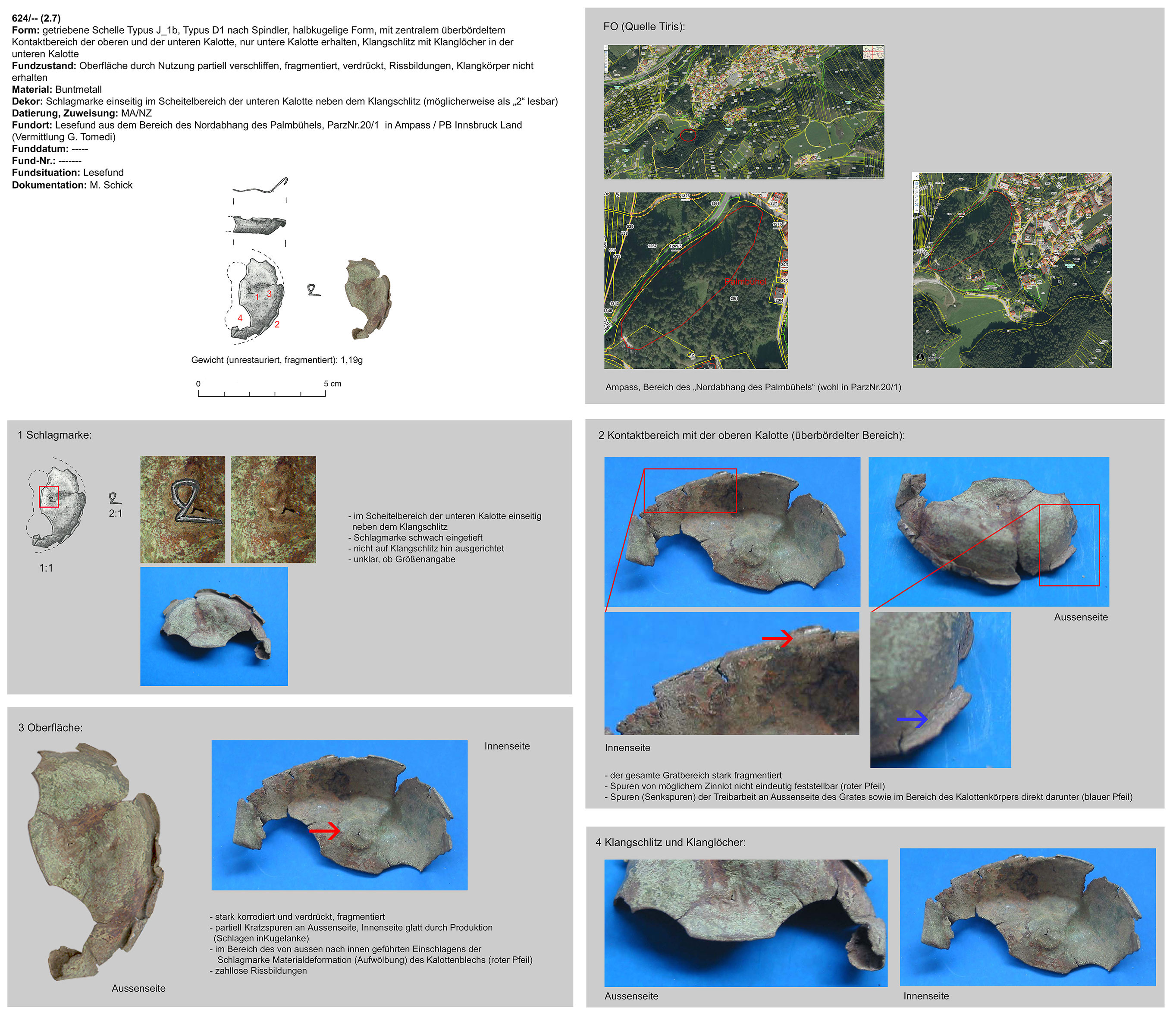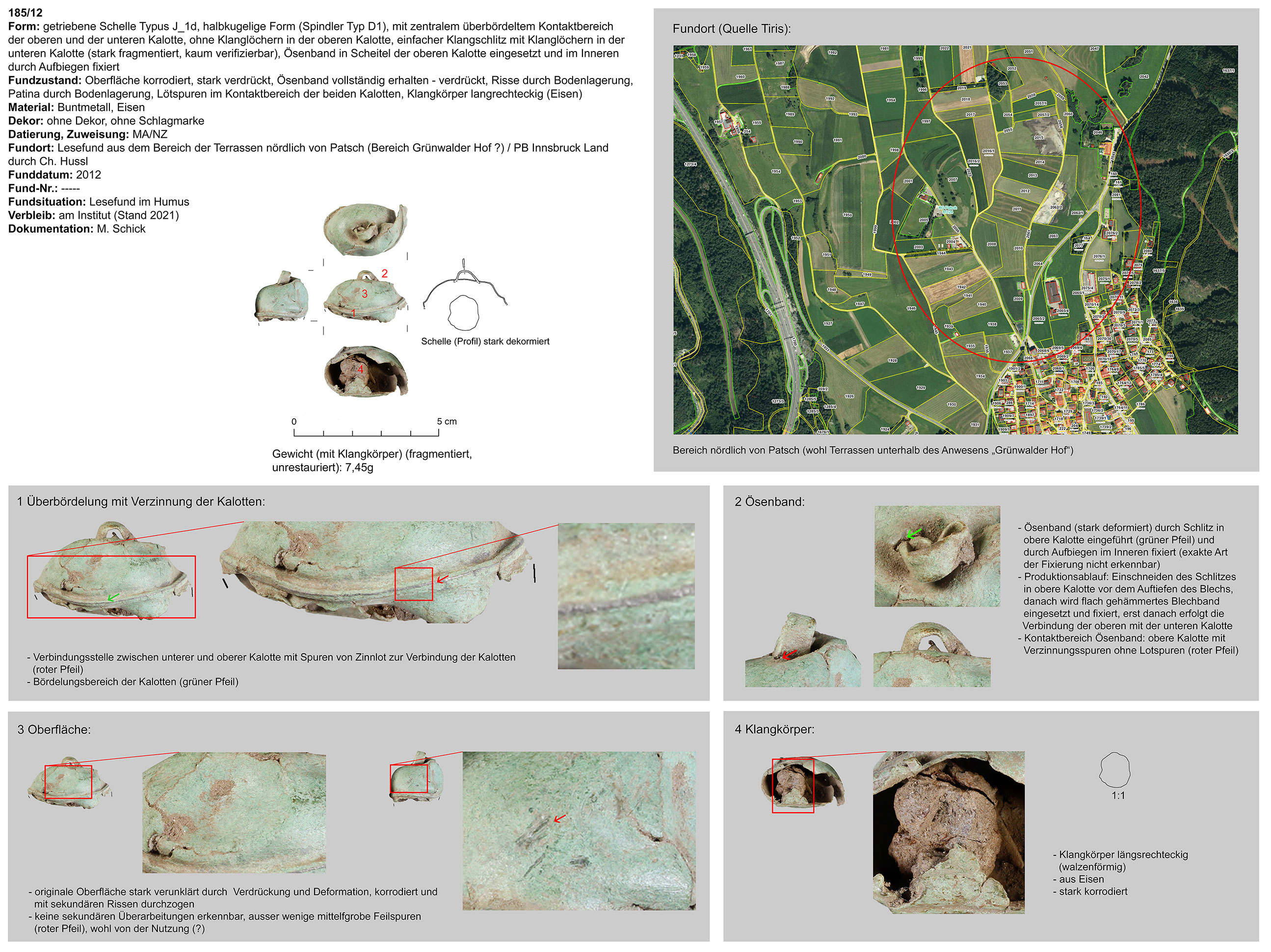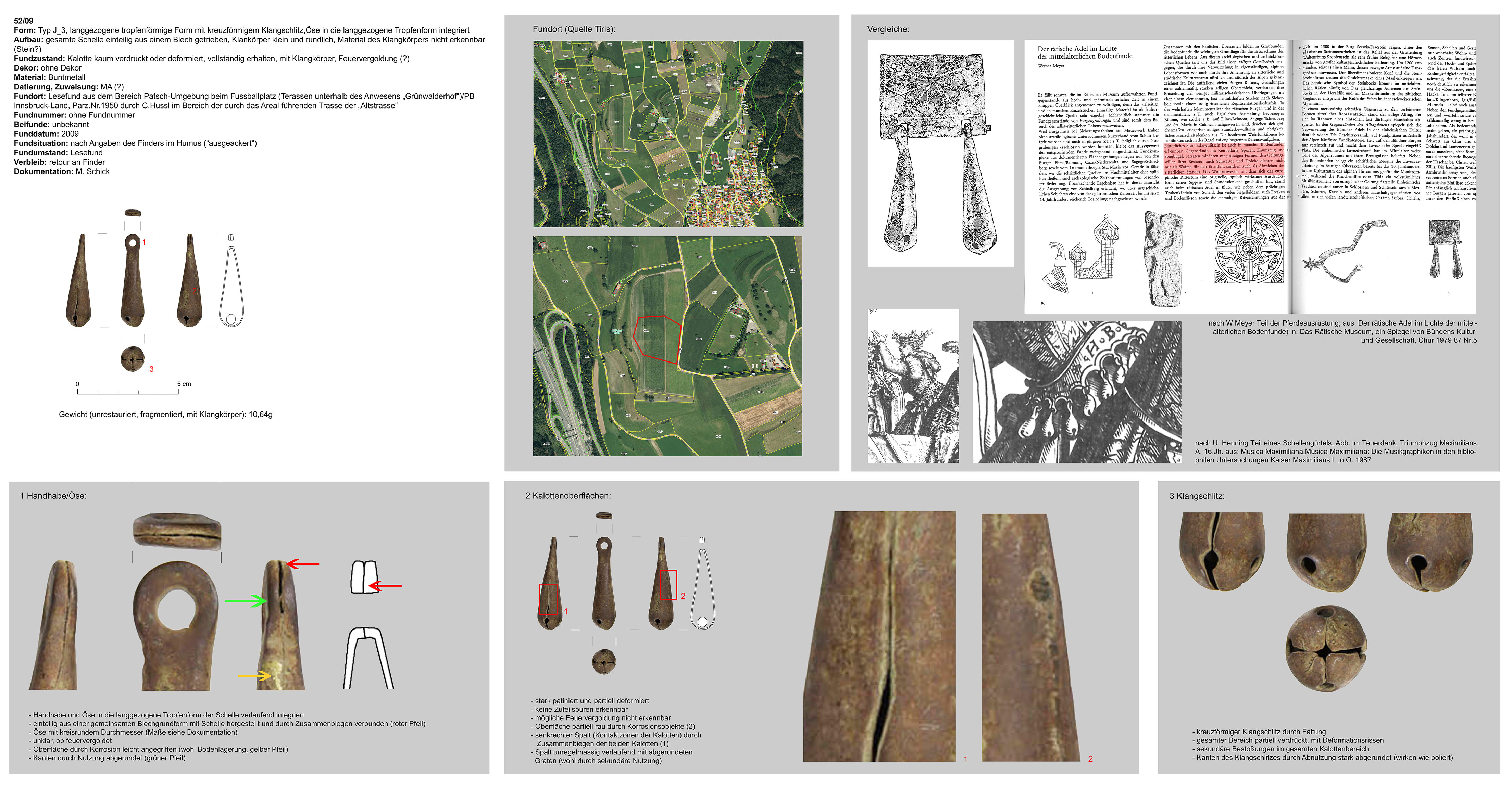 | 52/09 | einteilig (Kalotte mit integrierter Hängevorrichtung), langgezogen, tropfenförmig, kreuzförmiger Klangschlitz, Funktion unklar (Gewand, Gürtel) | nicht eruierbar | Patsch, Plateau, Fußballplatz (Ch. Hussl) | Mittellage (Lesefund) | ohne |
