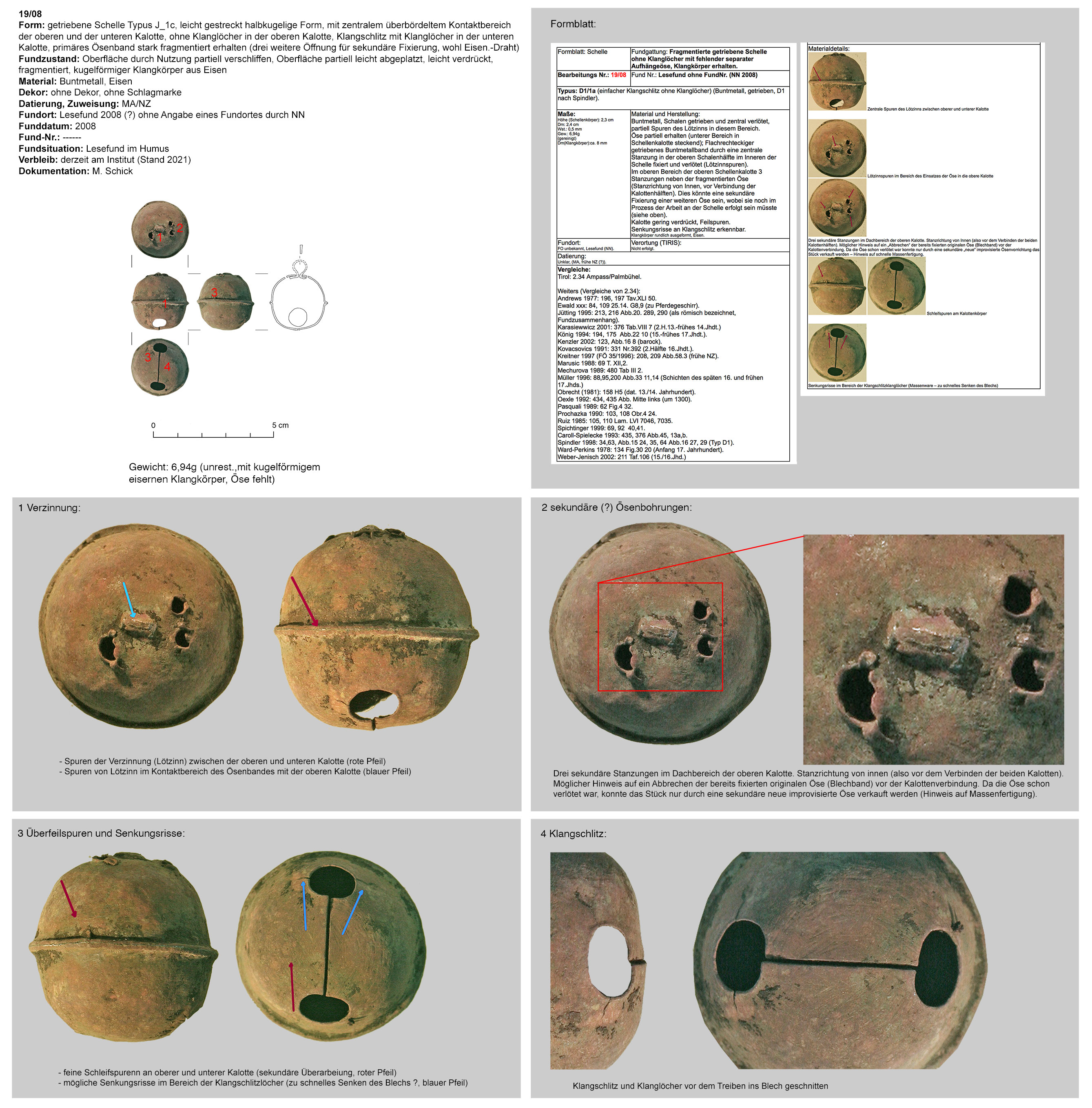 | 19/08 | zweiteilig (2 Kalotten), Ober-/Unterseite abgeplattet, Verbindungsbereich (zentraler Wulst) abgerundet, Öse ringförmig, Funktion unklar (Belle?) | kugelig, Eisen | unbekannt (Tiroler Oberland?) (NN) | unbekannt | ohne Marke/Dekor; 3 Löcher in oberer Kalotte neben Öse (wohl für primäre Öse) |