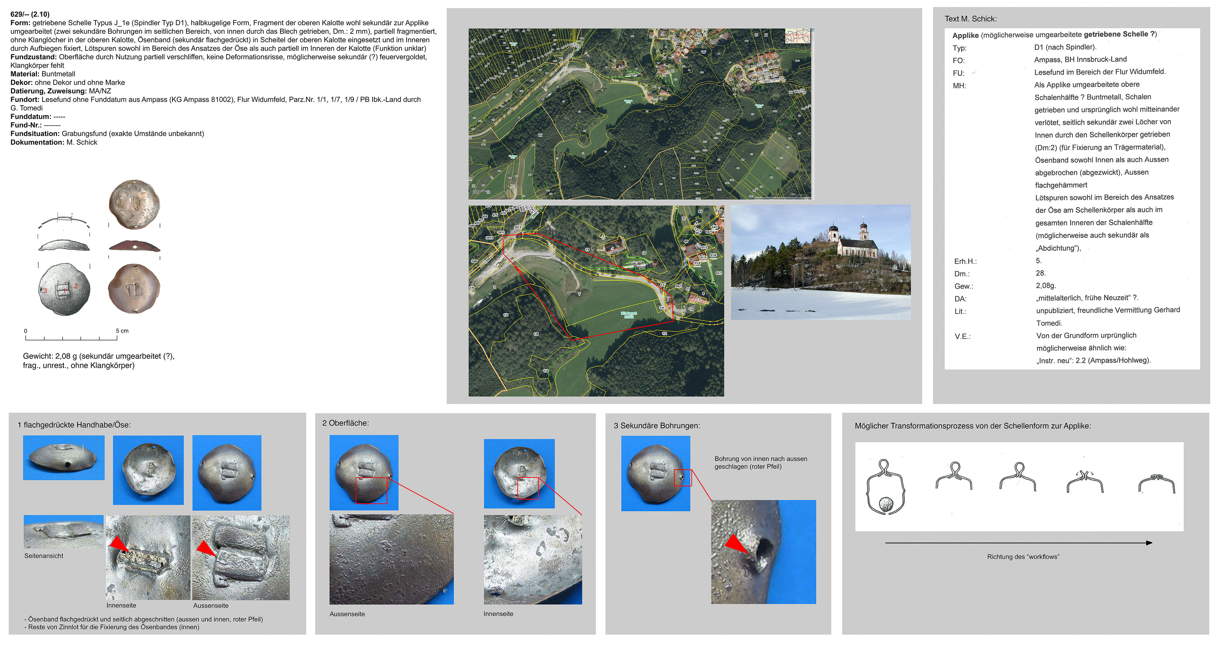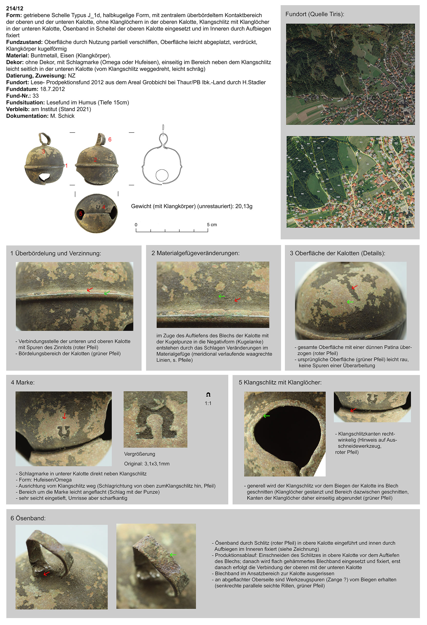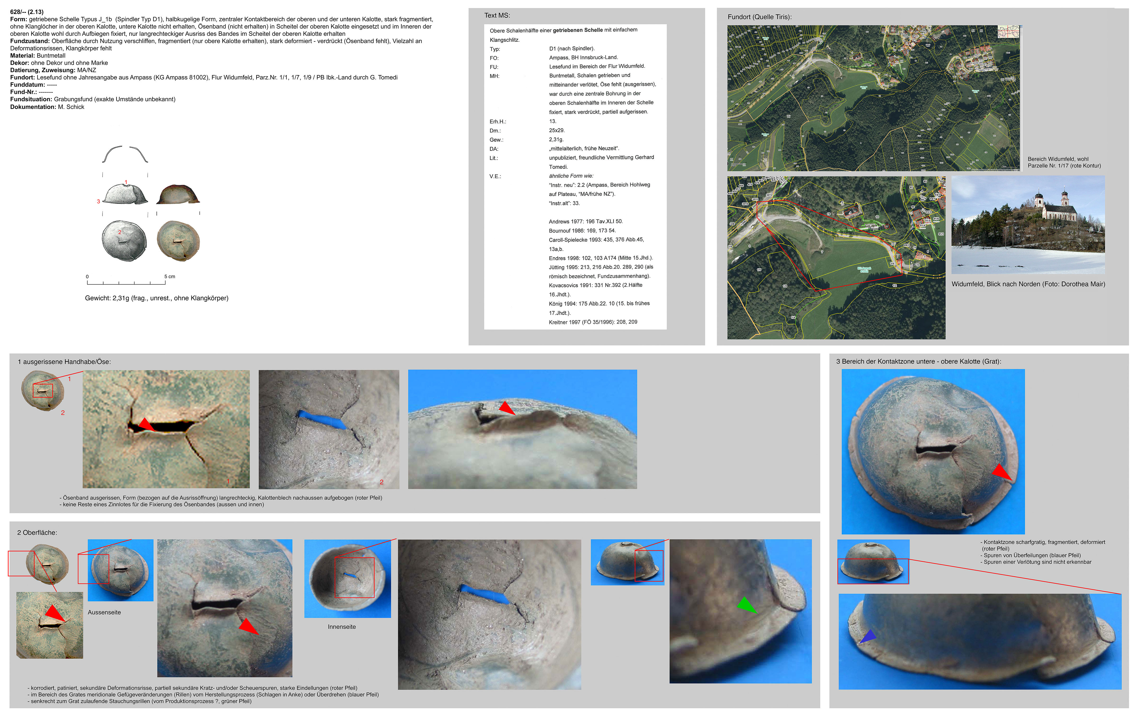 | 214/12 | zweiteilig (2 Kalotten), halbkugelig, zentraler Bereich überbördelt (verzinnt?), Verbindungsbereich abgerundet | rund, Eisen | Grobbichl, Thaur (H. Stadler) | Mittellage/Humus (Prospektionsfund) | Marke „Hufeisen“ oder „Omega“ neben Klangschlitz in unterer Kalotte (vom Klangschlitz weggedreht) |