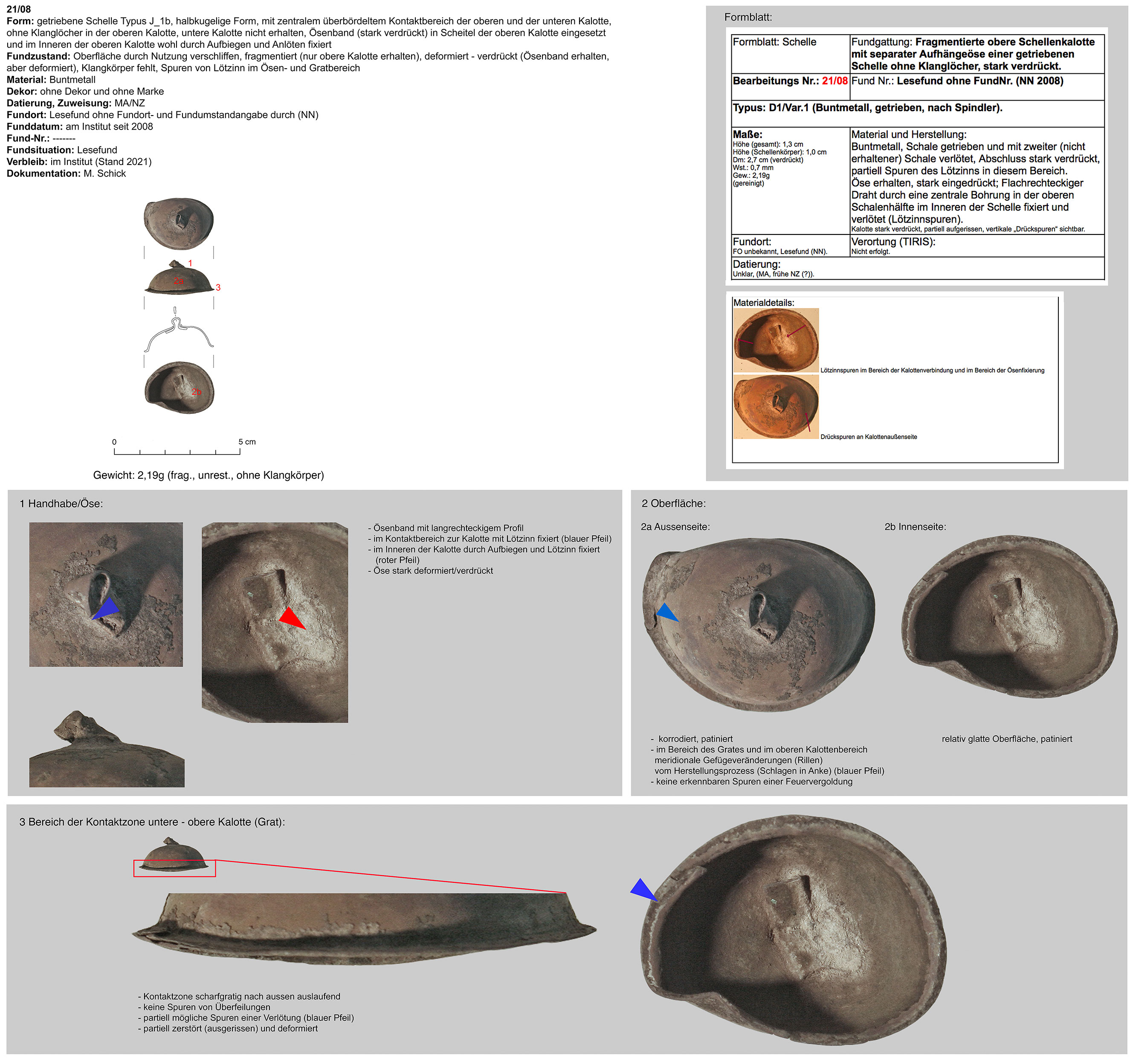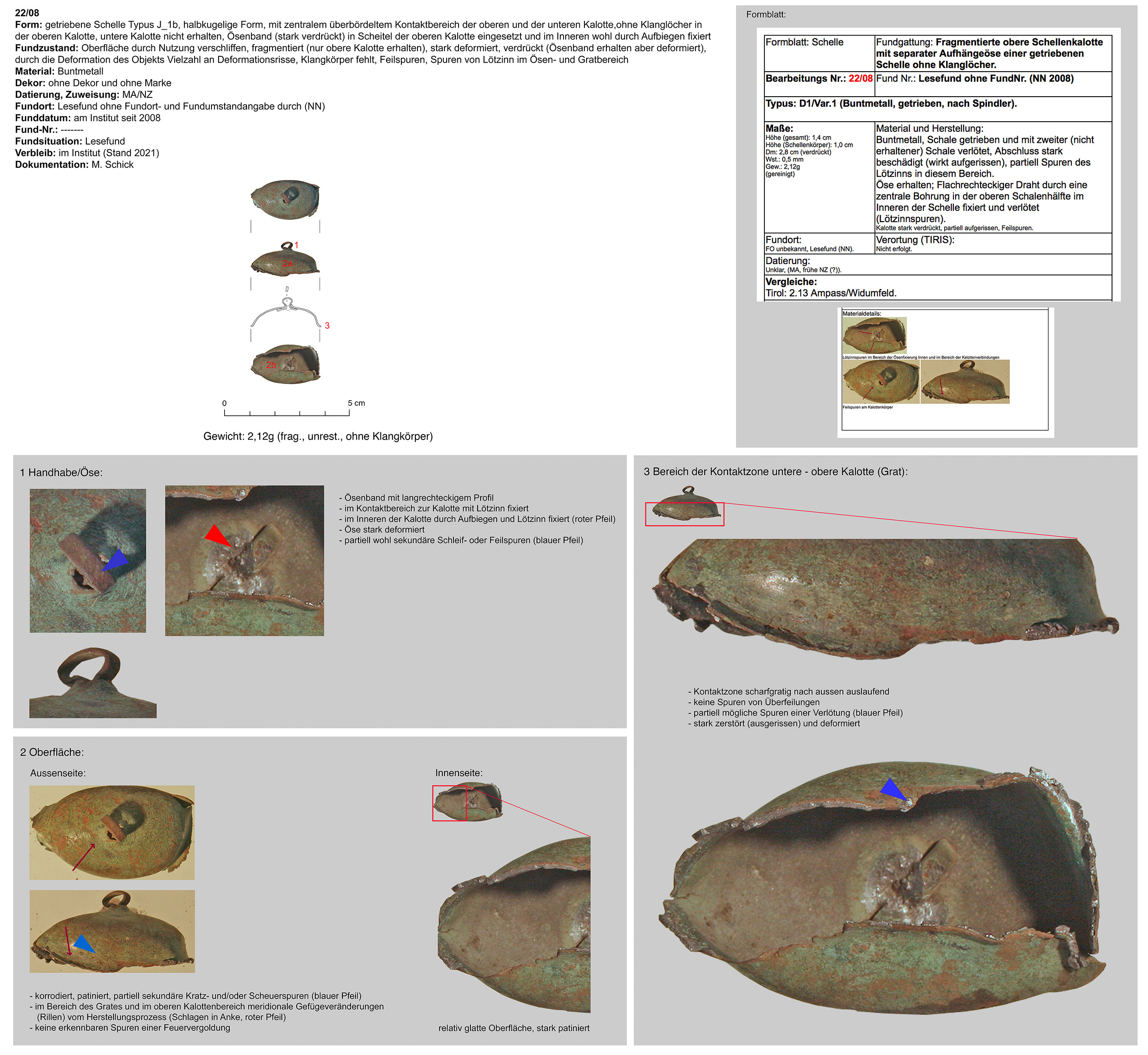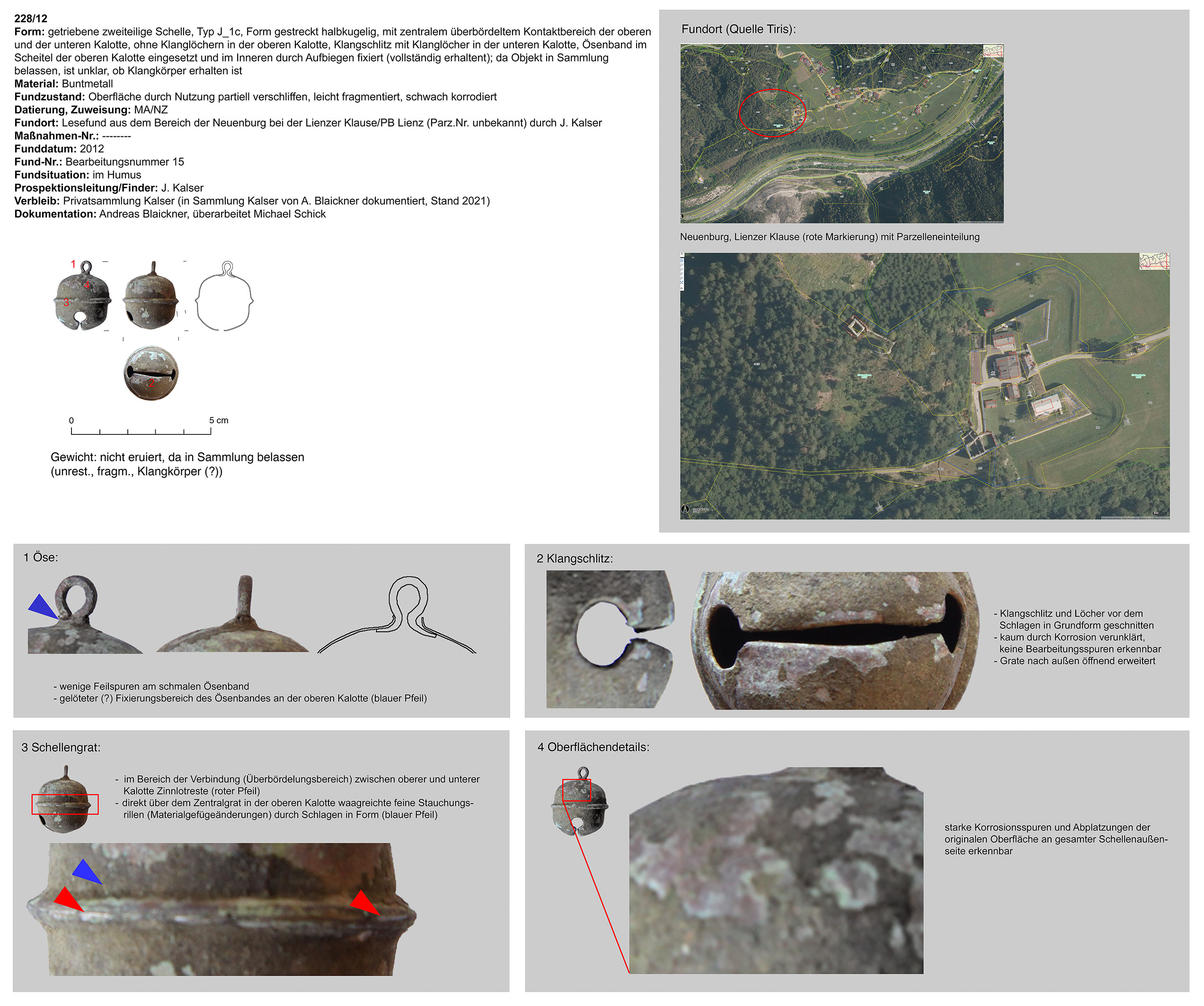 | 214/12 | zweiteilig (2 Kalotten), halbkugelig, zentraler Bereich überbördelt (verzinnt?), Verbindungsbereich abgerundet | rund, Eisen | Grobbichl, Thaur (H. Stadler) | Mittellage/Humus (Prospektionsfund) | Marke „Hufeisen“ oder „Omega“ neben Klangschlitz in unterer Kalotte (vom Klangschlitz weggedreht) |