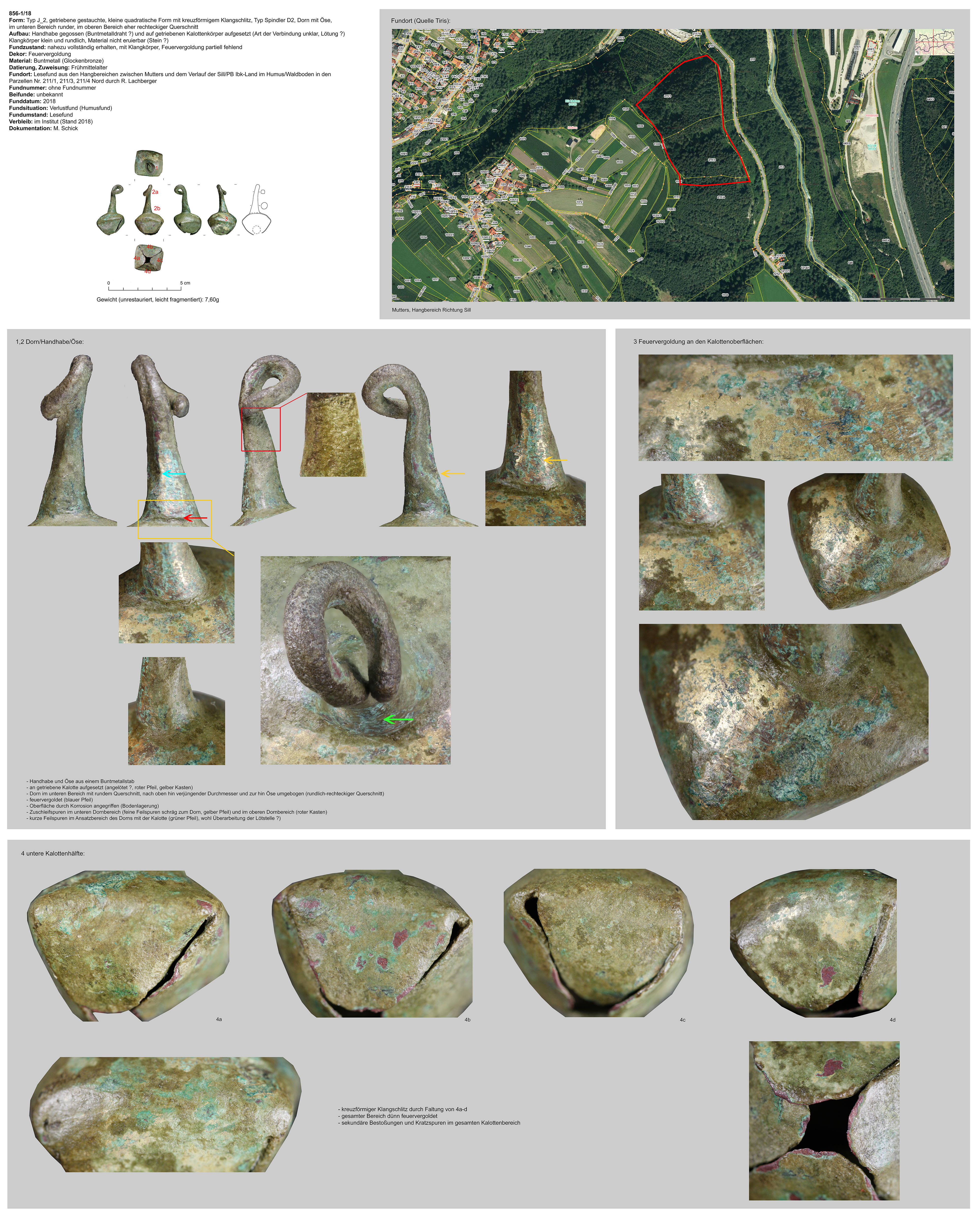 | 856-1/18 | zweiteilig (Kalotte mit Hängevorrichtung), ohne Wulst, quadratisch, gestaucht, kreuzförmiger Klangschlitz (gefaltet), Funktion unklar | vermutlich kleiner runder Stein | Hangbereich zwischen Mutters und der Sill/PB Ibk-Land in den Parzellen Nr.211/1, 211/3, 211/4 (R. Lachberger) | Tal-/Mittellage, Humus, Waldboden (Lesefund) | ohne |