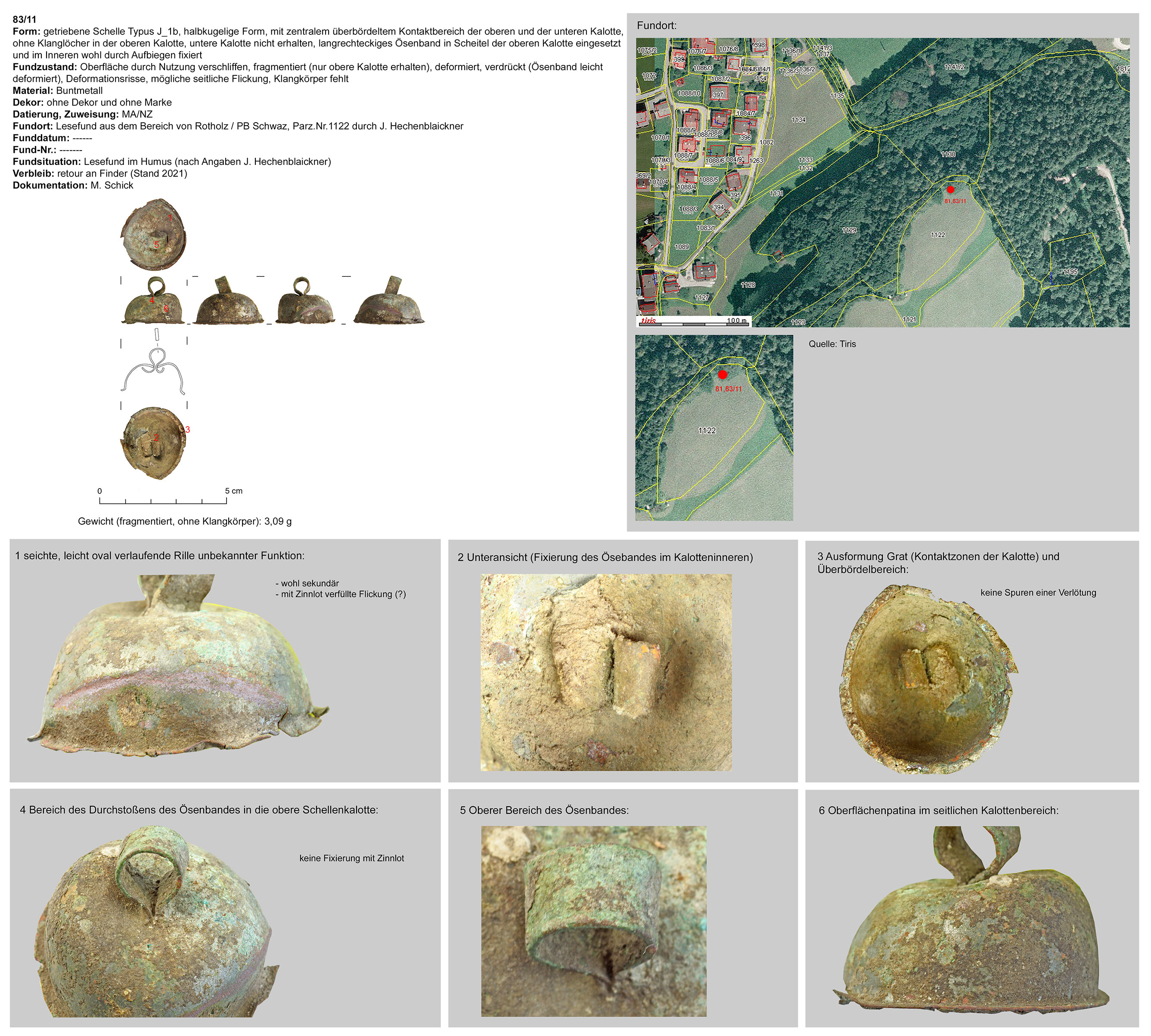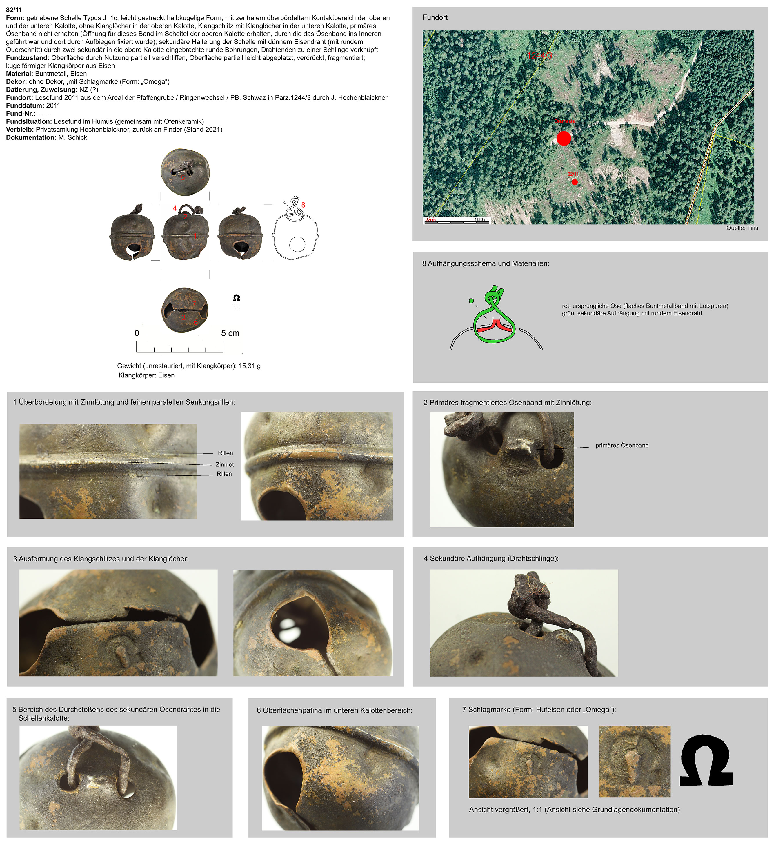 | 82/11 | zweiteilig (2 Kalotten), Ober-/Unterseite abgeplattet, Verbindungsbereich (zentraler Wulst) abgerundet, Öse ringförmig, Funktion unklar (Belle?) | kugelig, Eisen | Pfaffengrube/Ringenwechsel) (J. Hechenblaickner) | Hochlage (Lesefund) | Schlagmarke in unterer Kalotte neben Klangschlitz („Hufeisen“) |