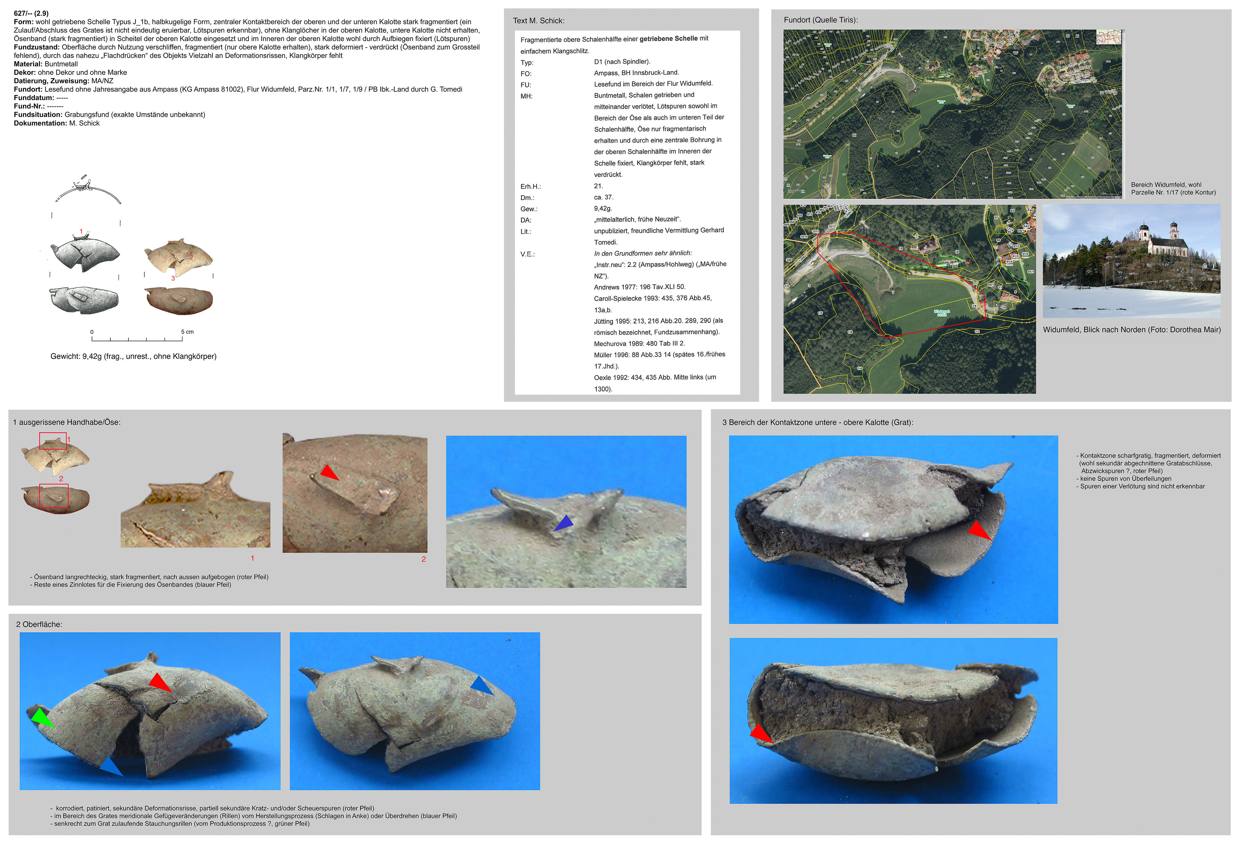 | 257/14 | zweiteilig (2 Kalotten), halbkugelig, zentraler Bereich überbördelt (verzinnt?), Verbindungsbereich abgerundet | nicht erhalten | Schweigerfeld, Kolsass (F. Erharter, H. Stadler) | Tallage (Surveyfund) | mögliche Marken direkt neben Klangschlitz (Linie oder Strichstern) |