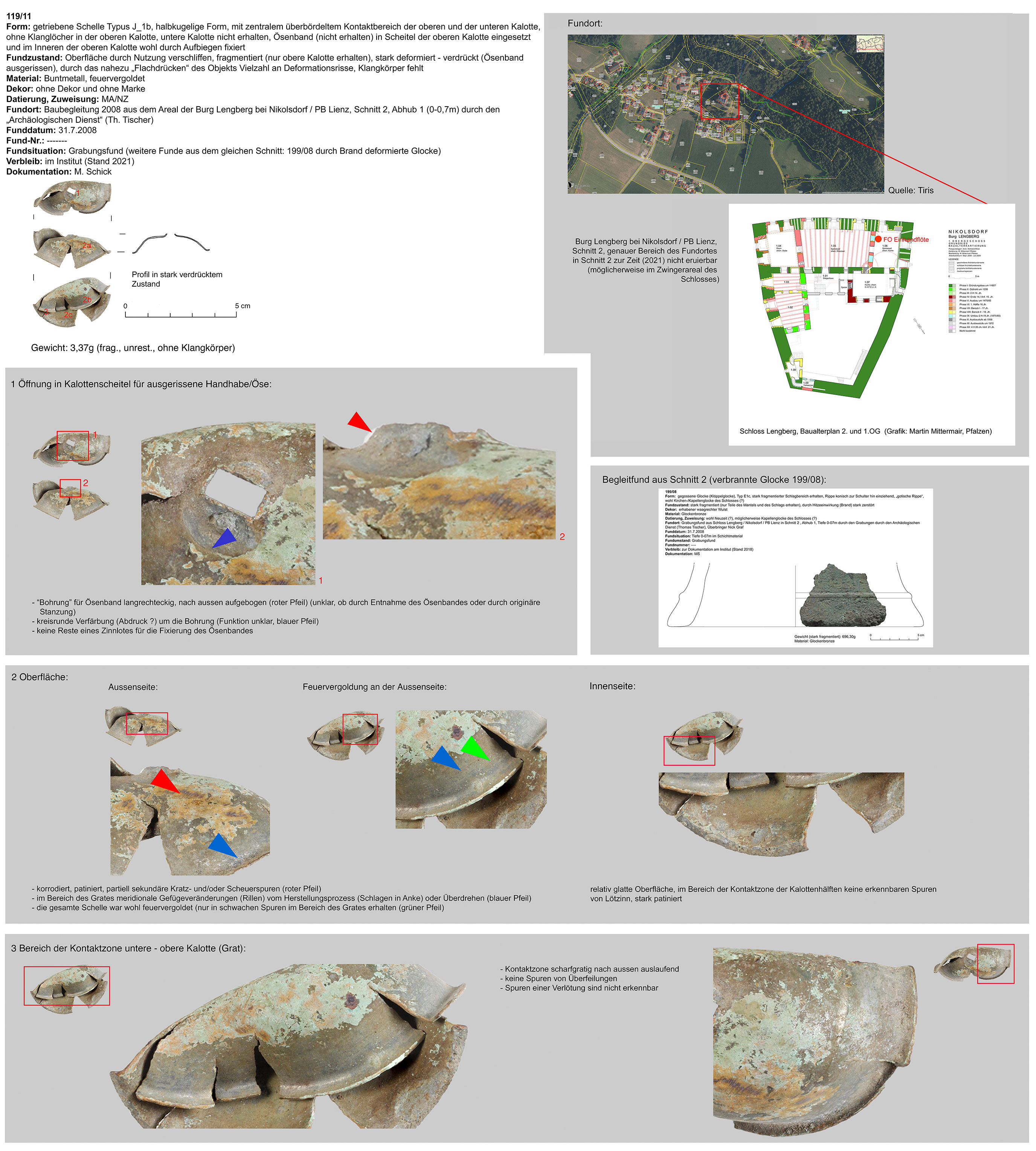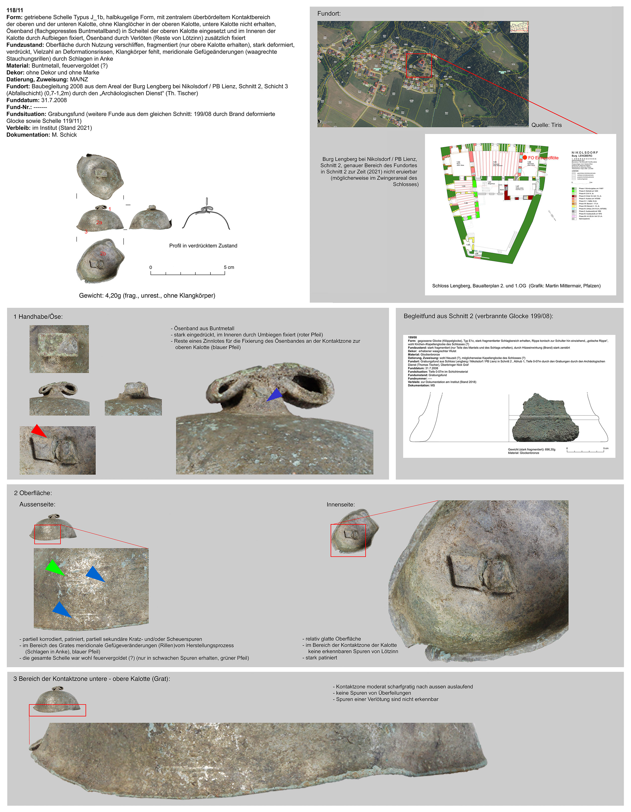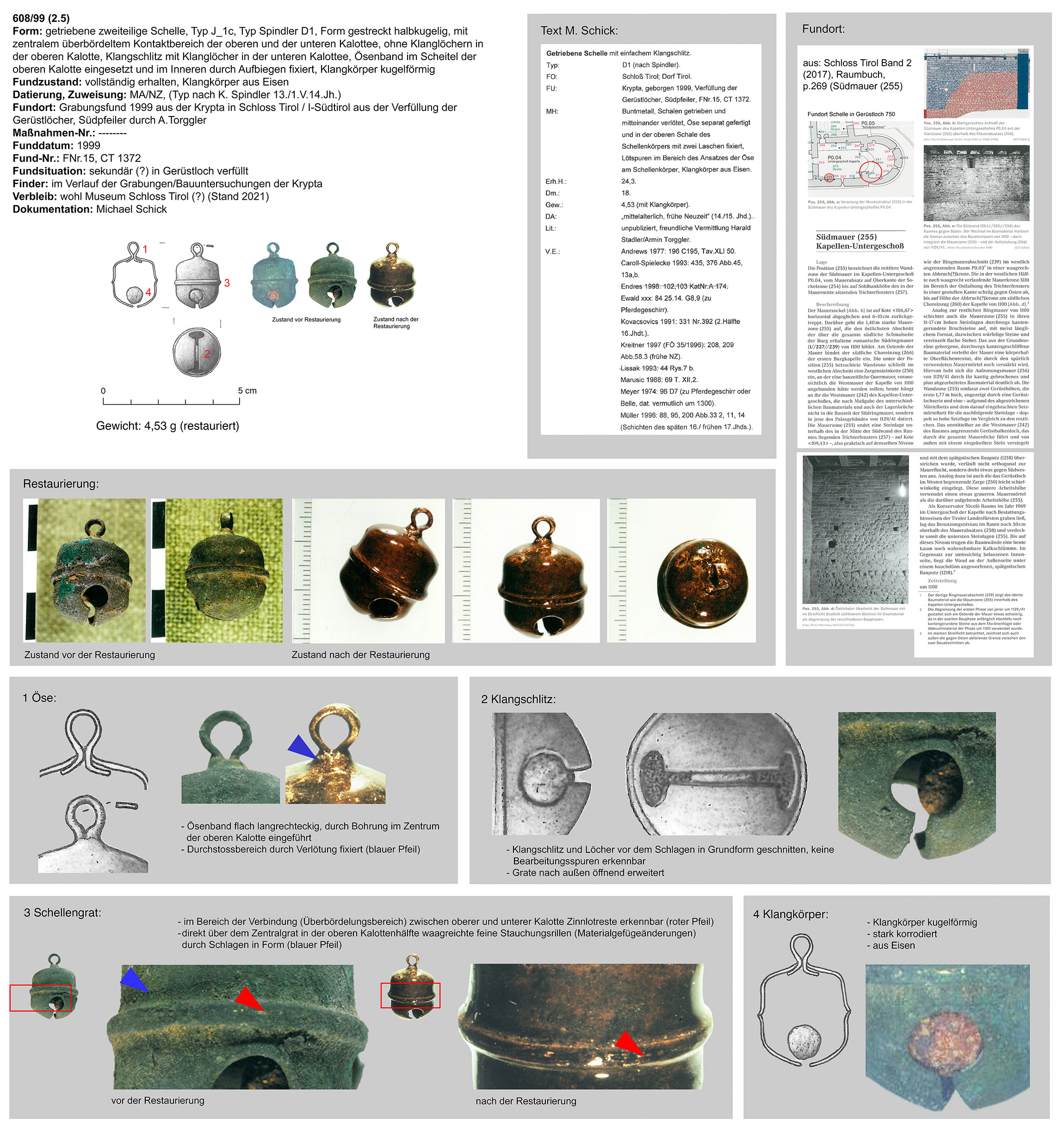 | 608/99 (2.5) | zweiteilig (2 Kalotten), Ober-/Unterseite abgeplattet, Verbindungsbereich (zentraler Wulst) abgerundet, Öse ringförmig, Funktion unklar (Belle?) | kugelförmig, Eisen | I-Schloss Tirol, Krypta Gerüstlöcher in Südpfeiler, FNr.15, CT 1372 (A. Torggler) | Mittellage/Burgareal (Grabungsfund 1999) | ohne |