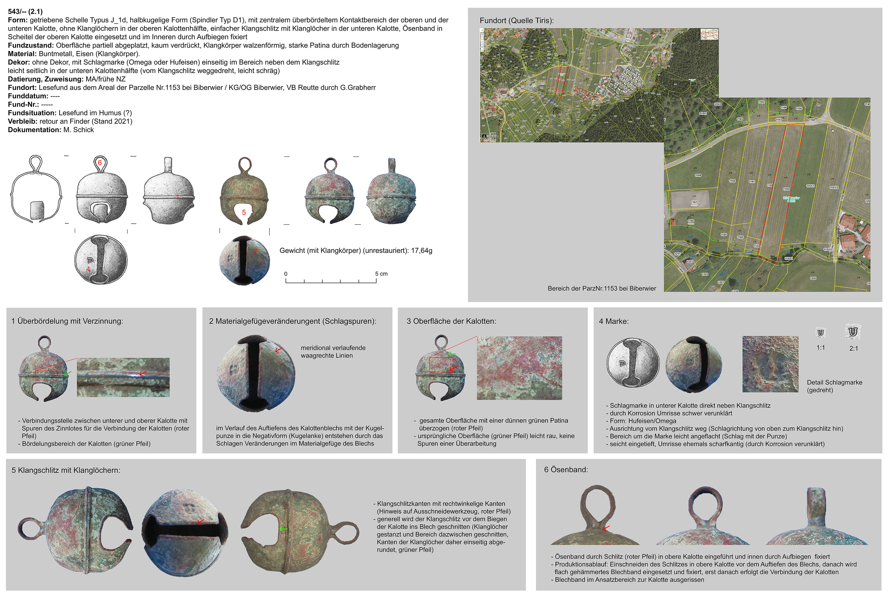 | 543/00 (82.1) | zweiteilig (2 Kalotten), halbkugelig, zentraler Bereich überbördelt (verzinnt?), Verbindungsbereich abgerundet | langrechteckig, Eisen | Biberwier, Parzelle 1153 (G. Grabherr) | Tallage (Grabungsfund) | Schlagmarke „U“ oder „Hufeisen in unterer Kalotte zentral neben Klangschlitz |