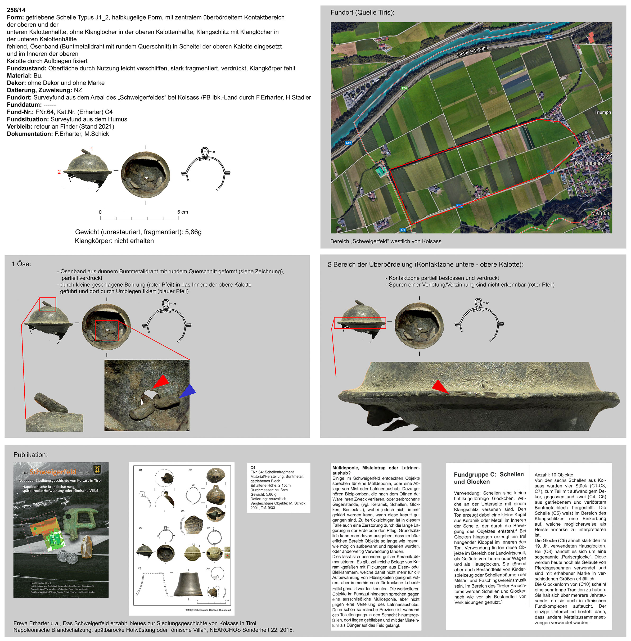 | 258/14 (fragmentiert) | zweiteilig (2 Kalotten), halbkugelig, zentraler Bereich überbördelt (verzinnt?), Wulst nicht abgerundet, Öse ringförmig, unklar (Belle?) | länglich, Eisen | Schweigerfeld Kolsass, Survey (F. Erharter, H. Stadler) | Tallage (Surveyfund) | ohne |