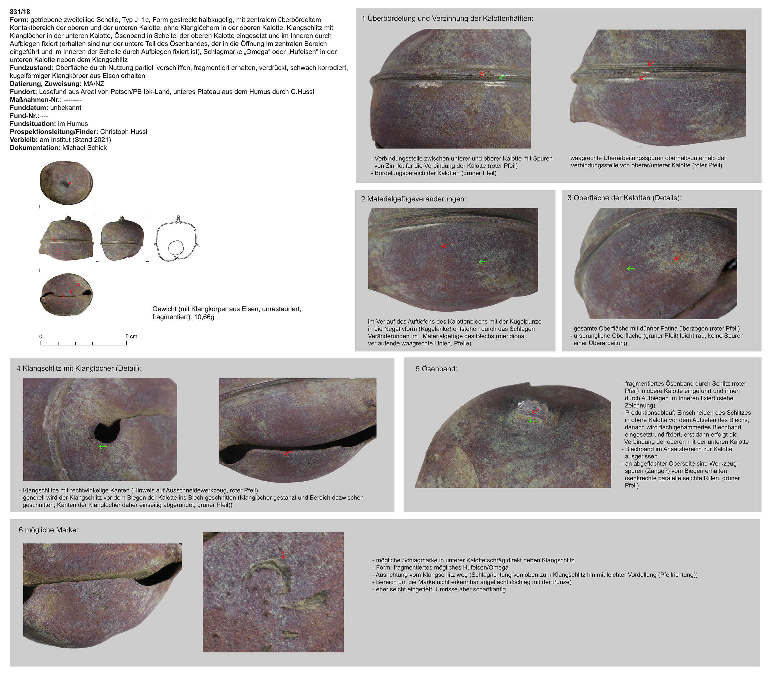 | 831/18 | zweiteilig (2 Kalotten), Ober-/Unterseite abgeplattet, Verbindungsbereich (zentraler Wulst) abgerundet, Öse ringförmig, Funktion unklar (Belle?) | kugelförmig, Eisen | Patsch, unteres Plateau (Ch. Hussl) | Mittellage/Humus (Lesefund) | Marke in Form eines Hufeisens oder Omega |
