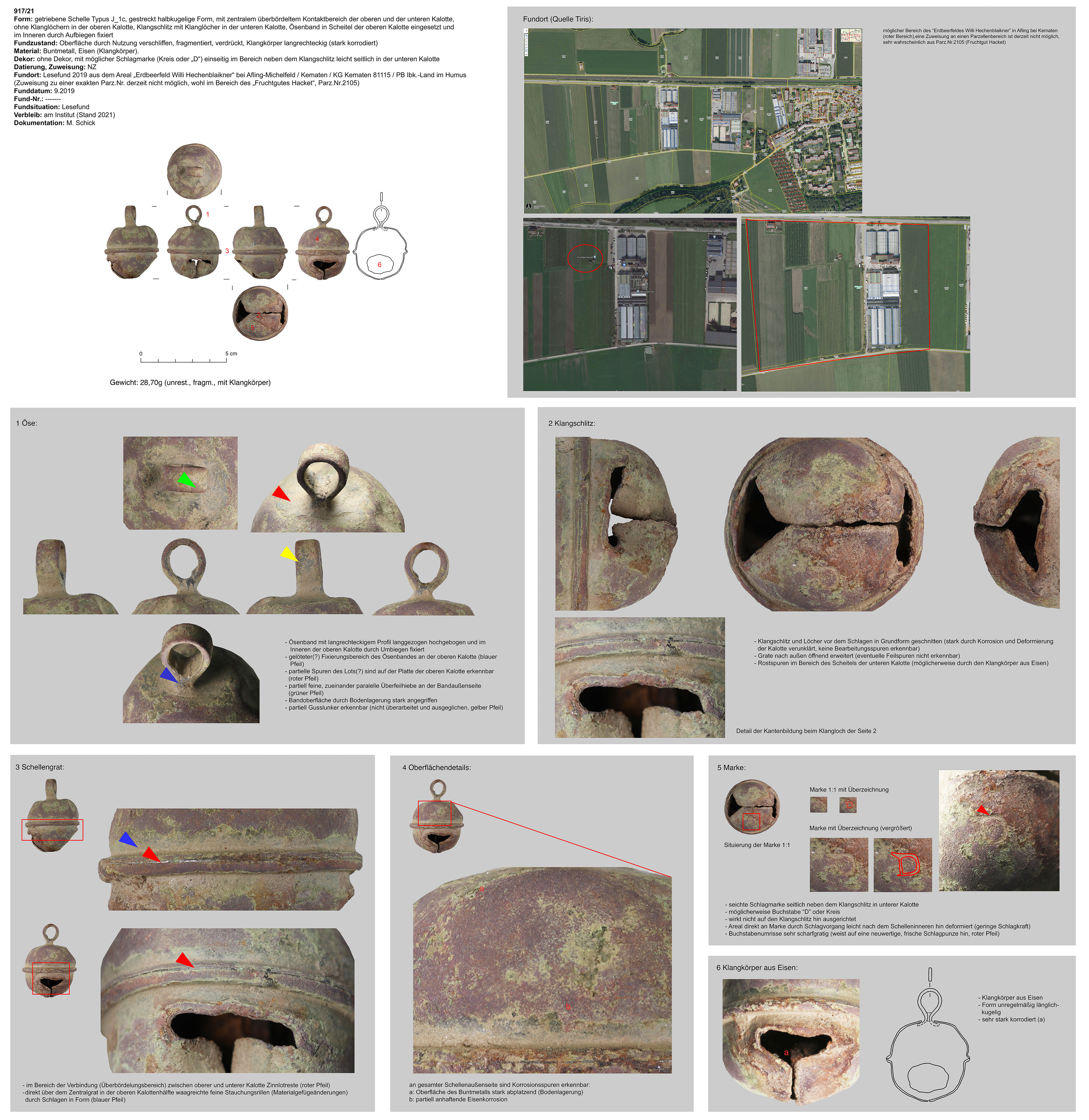 | 917/21 | zweiteilig (2 Kalotten), Ober-/Unterseite abgeplattet, Verbindungsbereich (zentraler Wulst) abgerundet, Öse ringförmig, Funktion unklar (Belle?) | länglich-kugelig, Eisen | Afling-Michlfeld bei Kematen/KG Kematen 81115/PB Ibk-Land, „Erdbeerfeld Willi Hechenblaickner“ (Fruchtgut Hacket), wohl Parz.Nr.2105 | Tallage (Lesefund) | Marke in Form eines „D“ oder Kreises |