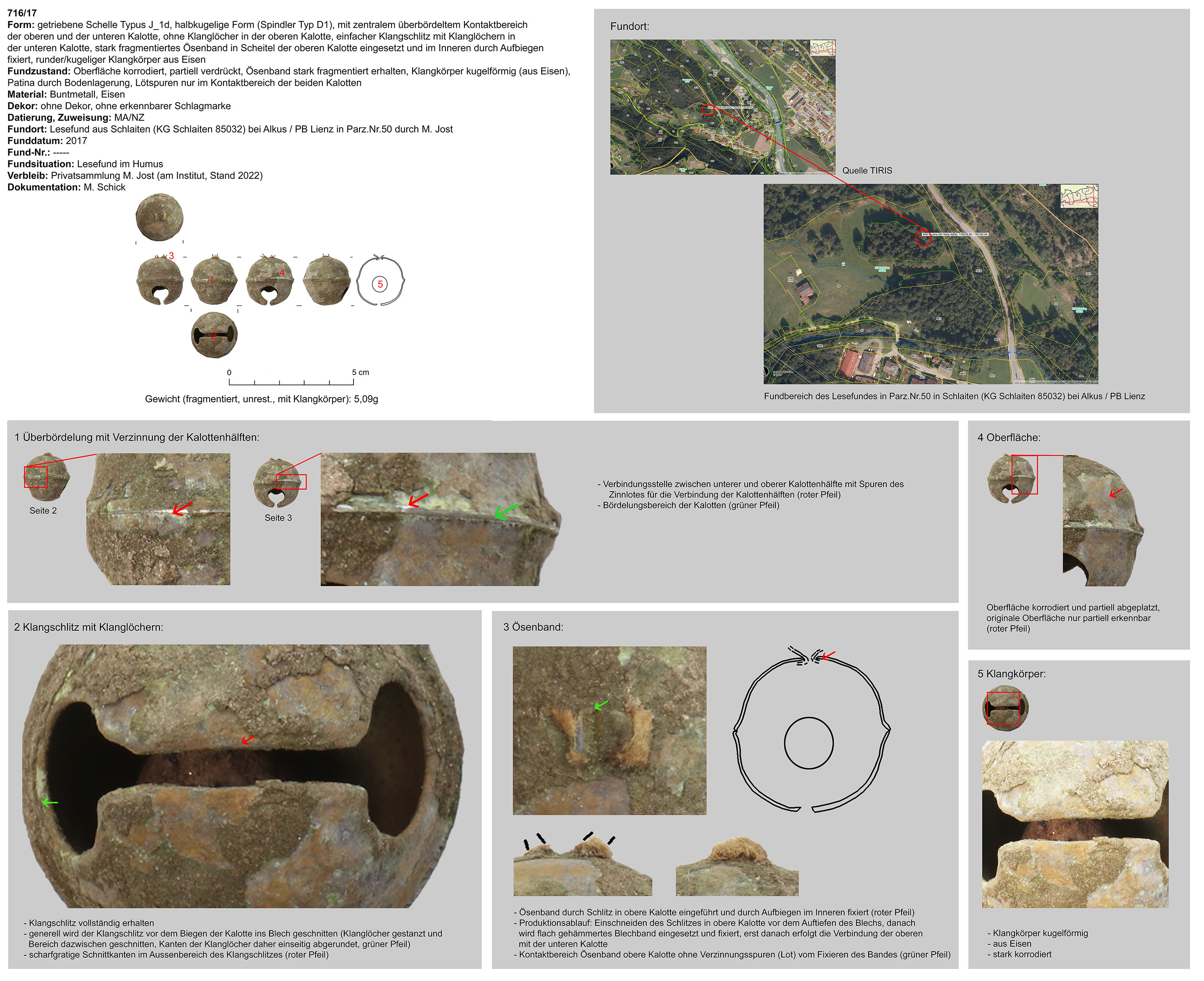 | 716/17 | zweiteilig (2 Kalotten), halbkugelig, zentraler Bereich überbördelt (verzinnt?), Verbindungsbereich abgerundet | kugelig, Eisen | Schlaiten (KG Schlaiten 85032) bei Alkus / PB Lienz in Parz.Nr.50 (M. Jost) | Mittellage (Lesefund) | ohne |