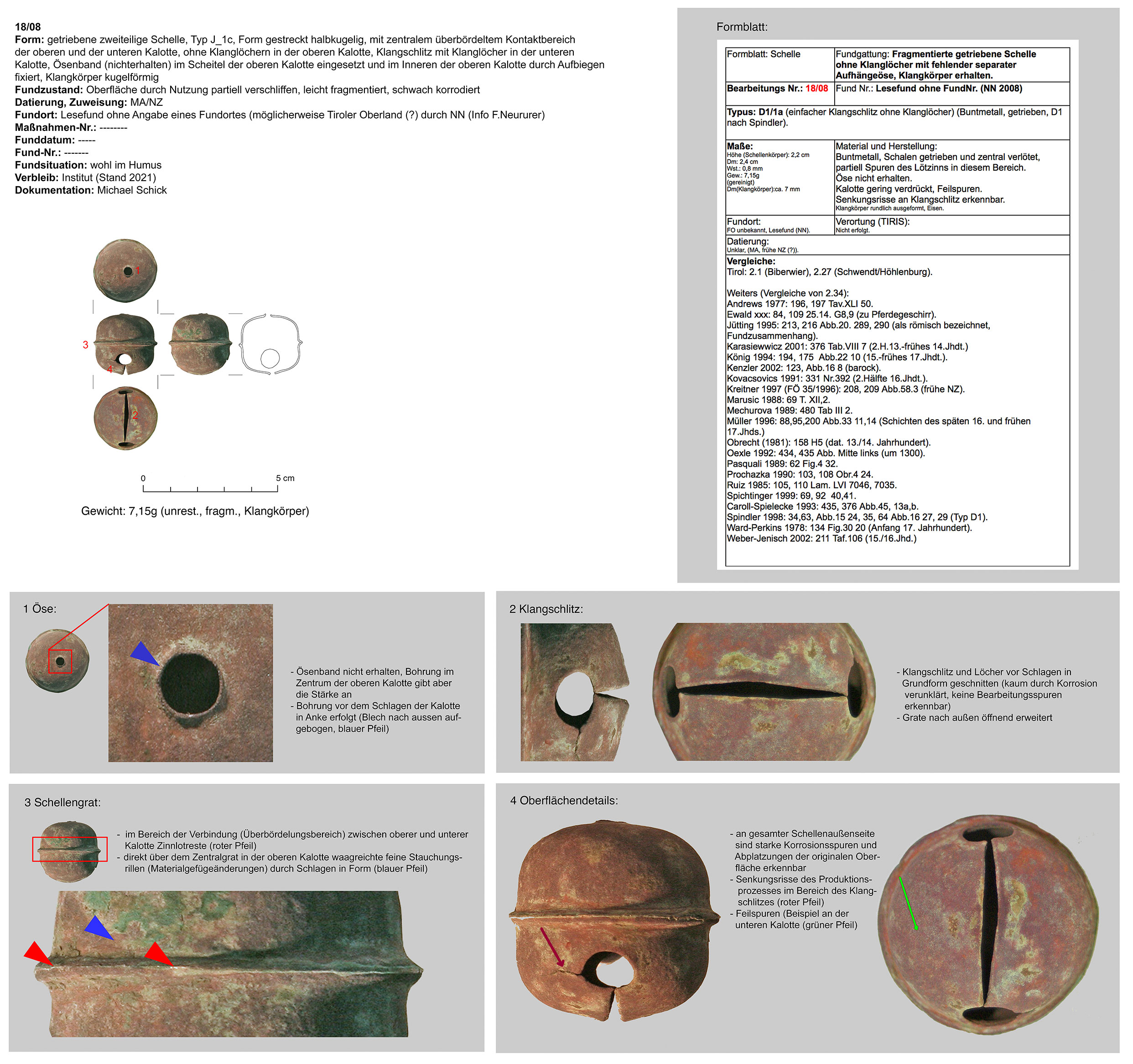 | 18/08 | zweiteilig (2 Kalotten), Ober-/Unterseite abgeplattet, Verbindungsbereich (zentraler Wulst) abgerundet, Öse ringförmig, Funktion unklar (Belle?) | kugelig, Eisen | unbekannt (Tiroler Oberland?) (NN) | unbekannt | ohne |