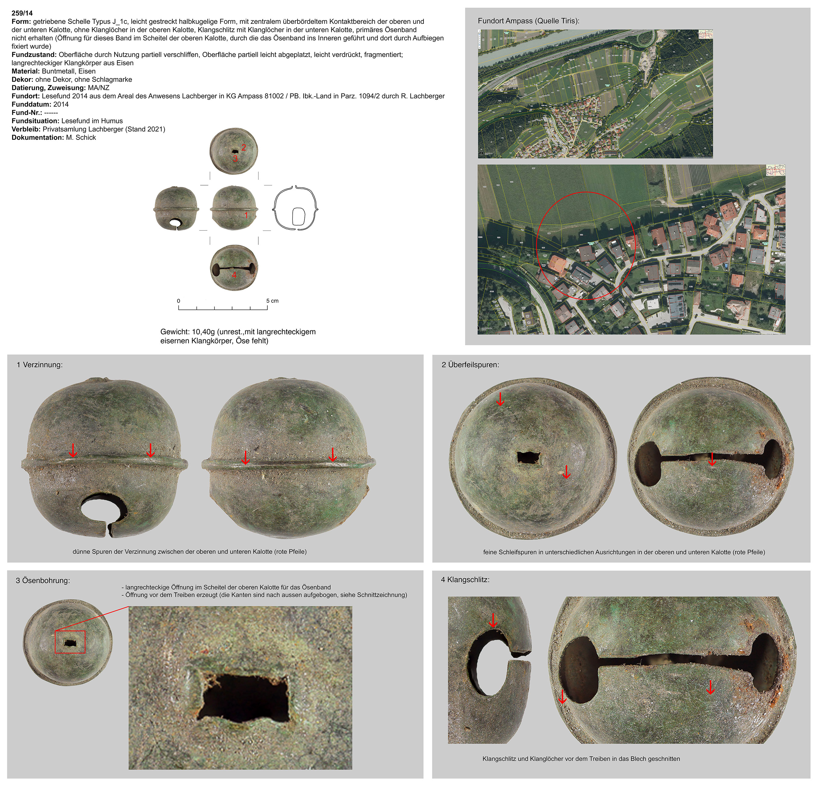 | 259/14 | zweiteilig (2 Kalotten), Ober-/Unterseite abgeplattet, Verbindungsbereich (zentraler Wulst) abgerundet, Öse ringförmig, Funktion unklar (Belle?) | langrechteckig, Eisen | Ampass, Anwesen Lachberger (R. Lachberger) | Tallage (Lesefund) | ohne |