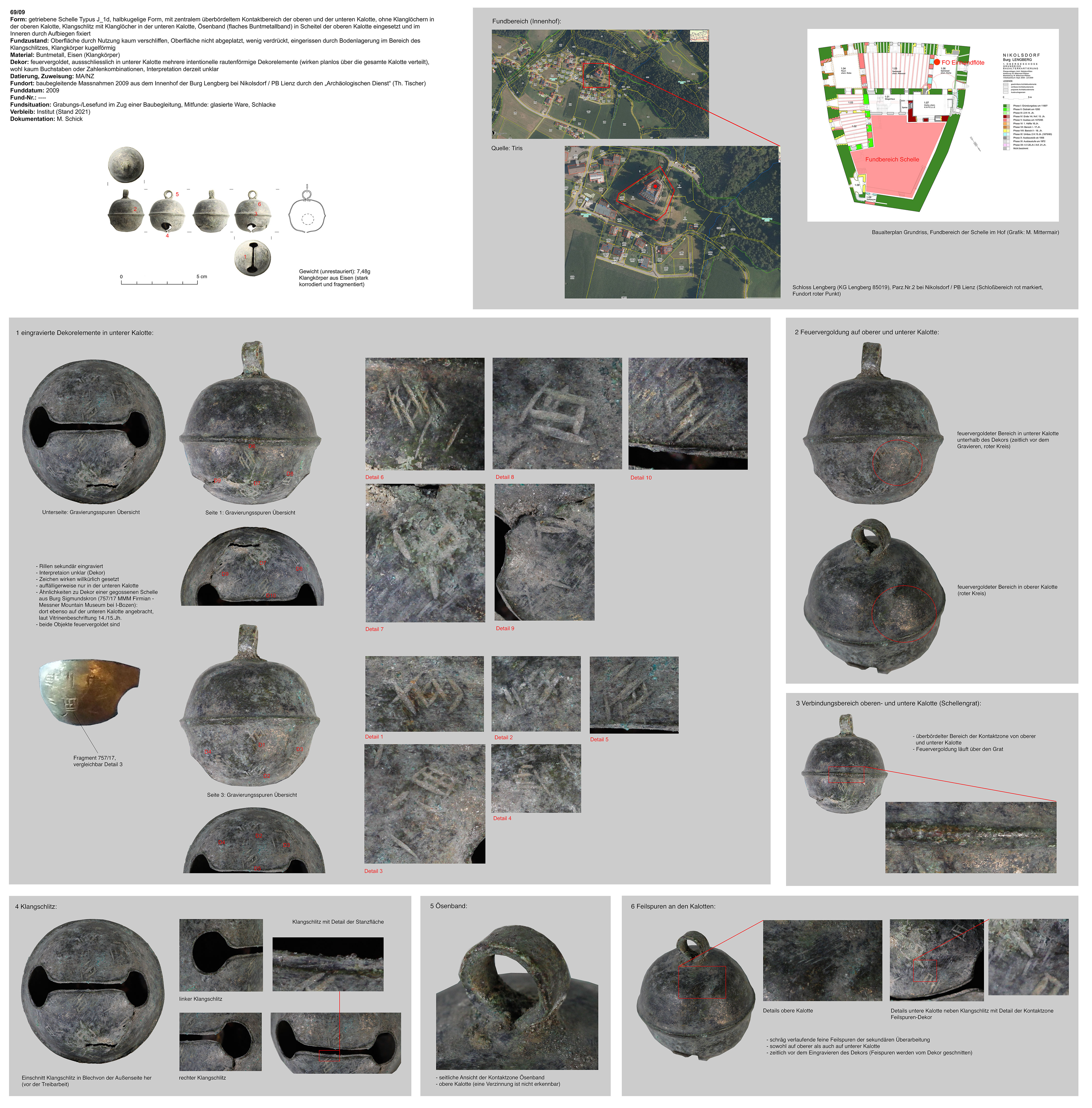 | 69/09 | zweiteilig (2 Kalotten), halbkugelig, zentraler Bereich überbördelt (verzinnt?), Verbindungsbereich abgerundet | kugelig, Eisen | Schloss Lengberg, Hofareal (Th. Tischer, H. Stadler) | Tallage/Burgareal (Grabungsfund 2009) | Marke (eingraviert) in unterer Kalotte („vier X“) (?), weitere Pictogramme auf der unteren Kalotte, Funktion unklar |