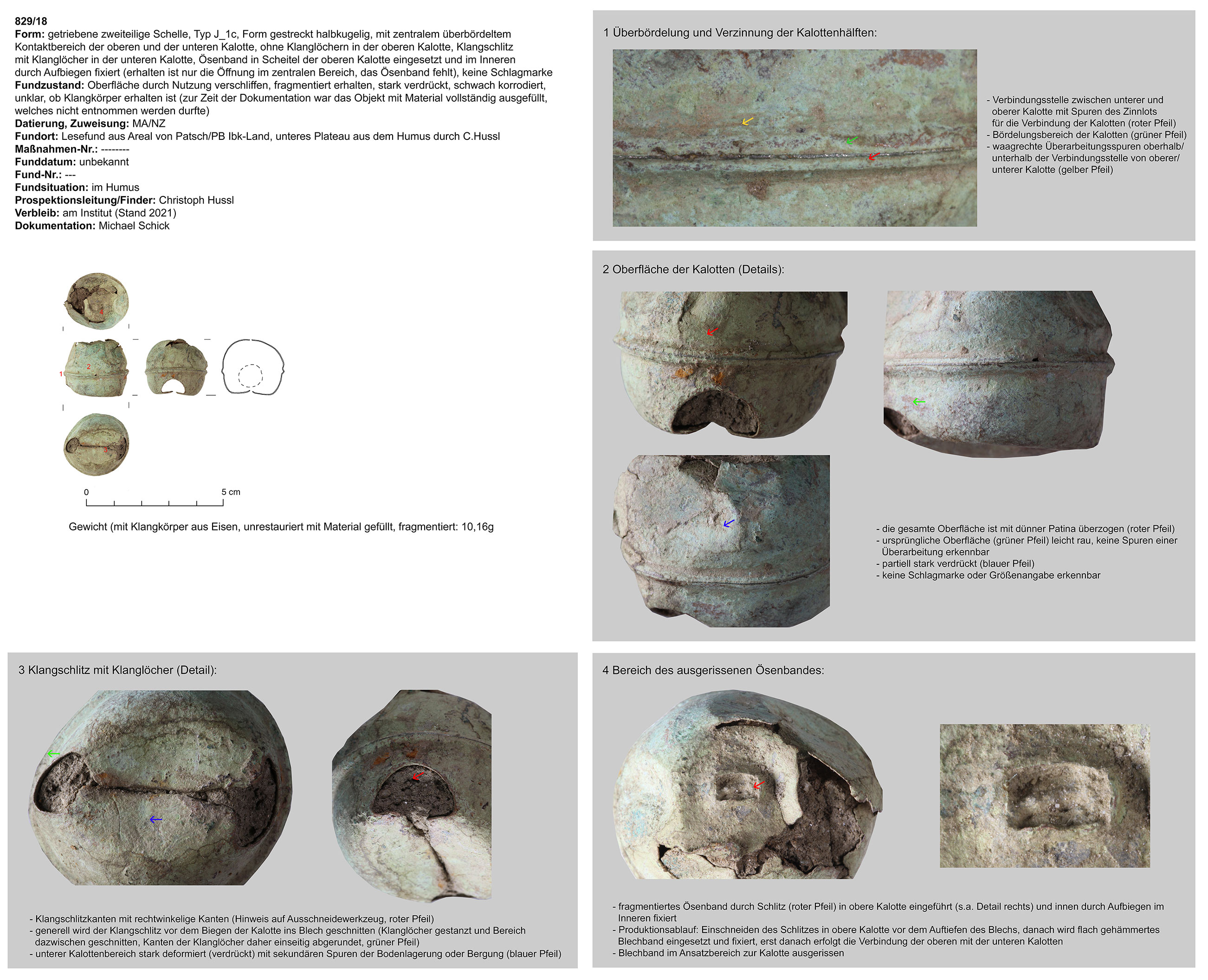 | 829/18 (fragmentiert) | zweiteilig (2 Kalotten), Ober-/Unterseite abgeplattet, Verbindungsbereich (zentraler Wulst) abgerundet, Öse ringförmig, Funktion unklar (Belle?) | nicht eruierbar | Patsch, unteres Plateau (Ch. Hussl) | Mittellage/Humus (Lesefund) | ohne |