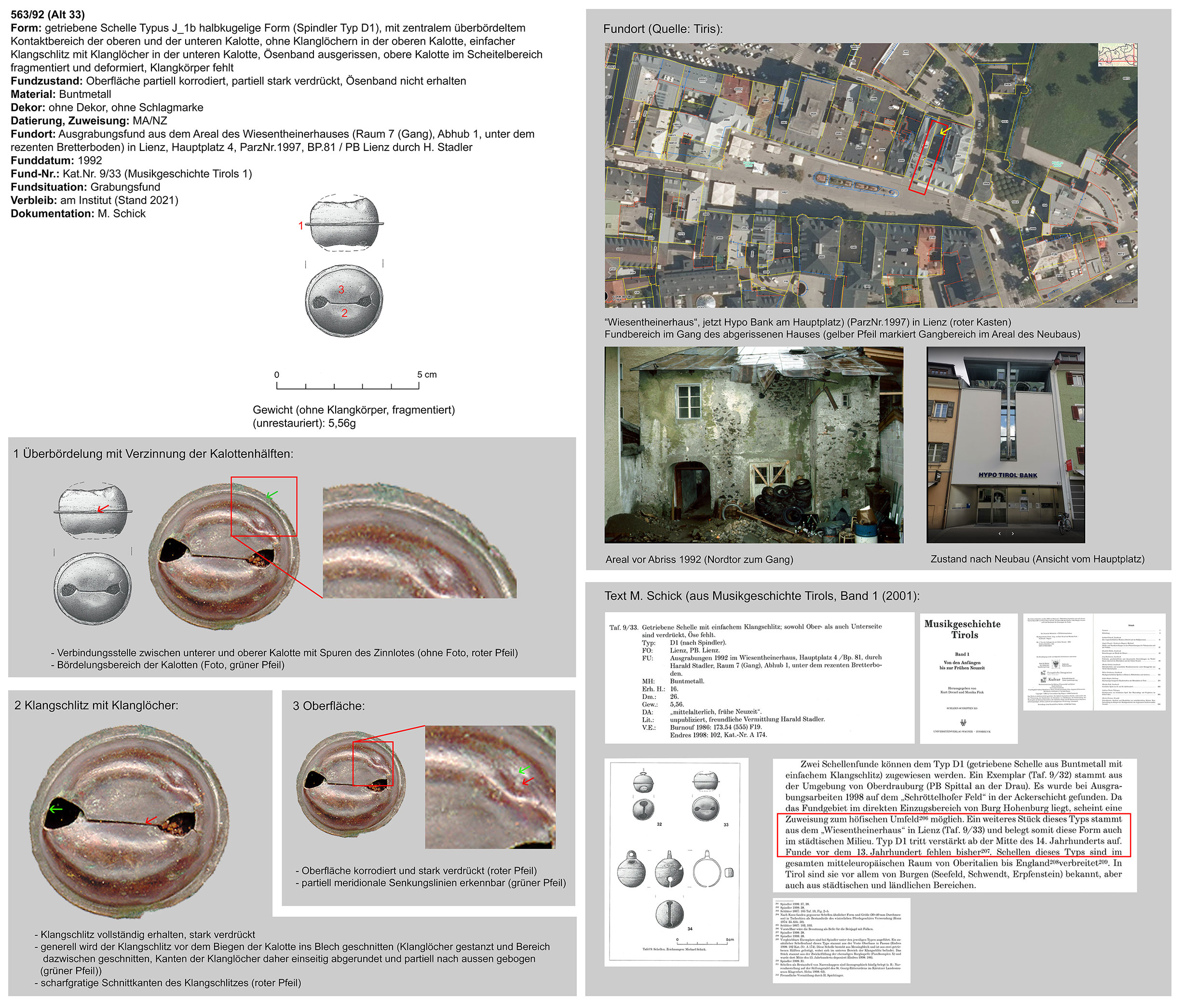 | 563/92 (33) | zweiteilig (2 Kalotten), halbkugelig, zentraler Bereich überbördelt (verzinnt?), Wulst nicht abgerundet, Öse ringförmig, unklar (Belle?) | nicht eruierbar | Lienz, Wiesentainerhaus, Raum 7 - Gang, unter Bretterboden (H. Stadler) | Tallage/Stadtkern (Grabungsfund) | ohne |