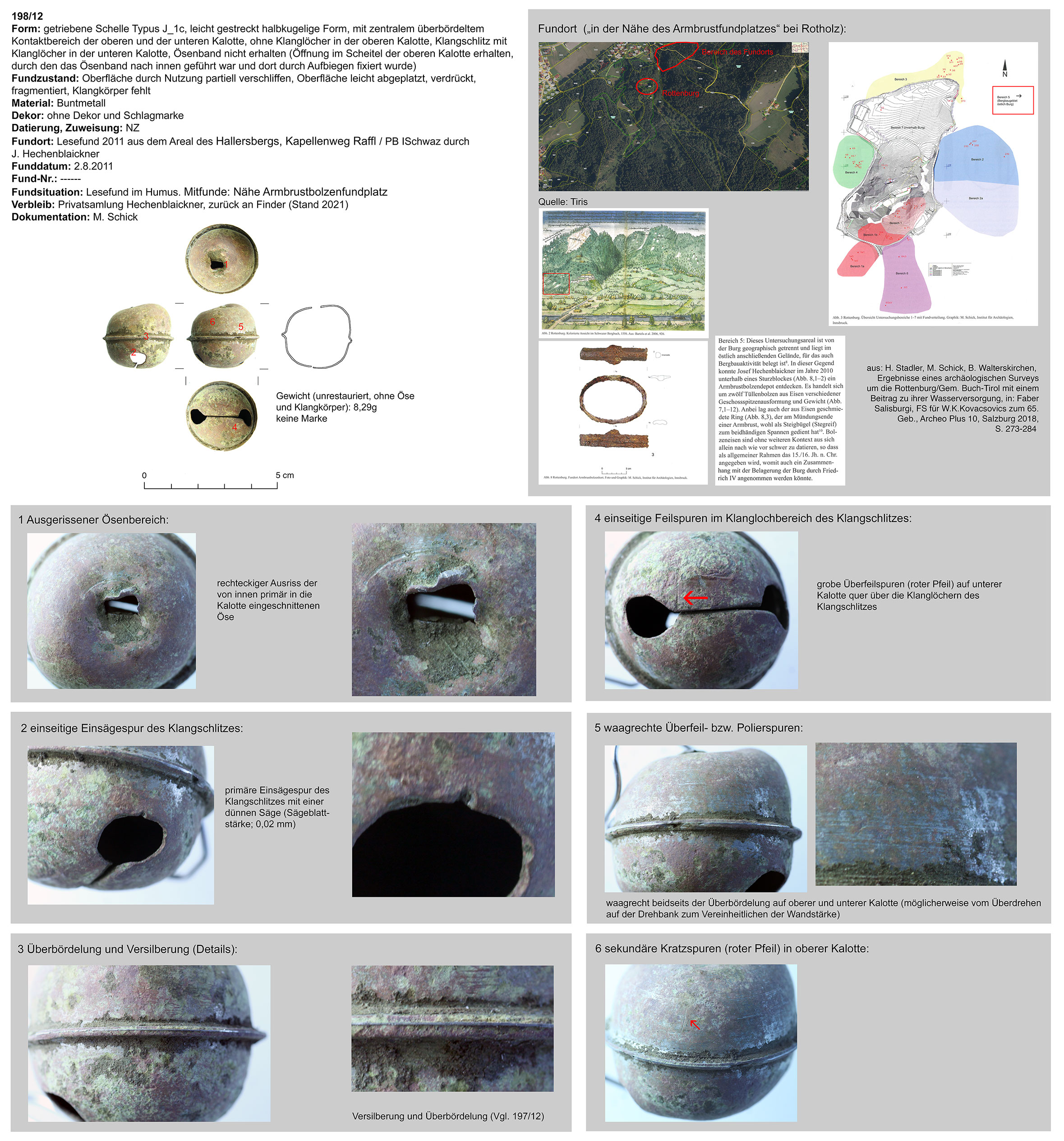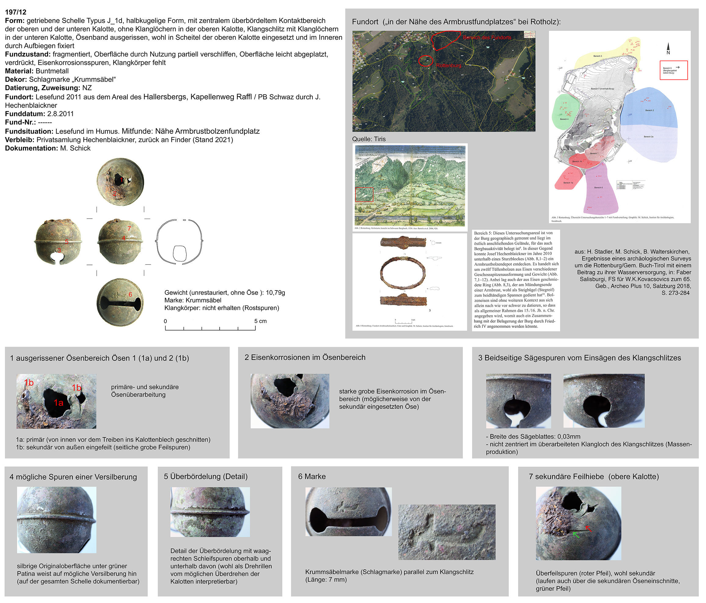 | 197/12 (fragmentiert) | zweiteilig (2 Kalotten), halbkugelig, zentraler Bereich überbördelt (verzinnt?), Verbindungsbereich abgerundet | nicht erhalten (Eisen) | Hallersberg, Kapellenweg Raffl, Schwaz (J. Hechenblaikner) | Hochlage/Humus (Lesefund) | Schlagmarke „Krummsäbel“ in unterer Kalotte neben Klangschlitz |