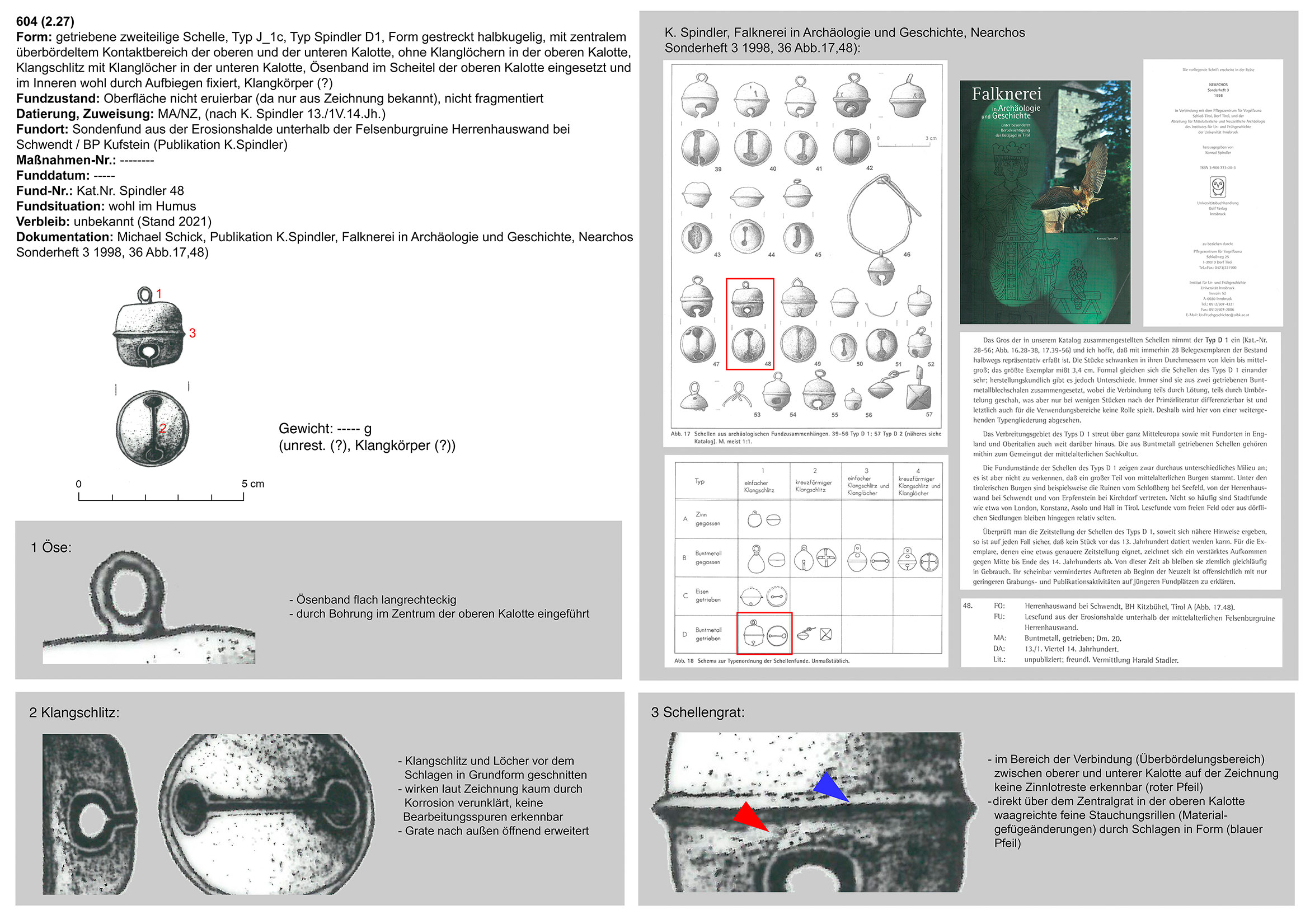 | 604 (2.27) | zweiteilig (2 Kalotten), Ober-/Unterseite abgeplattet, Verbindungsbereich (zentraler Wulst) abgerundet, Öse ringförmig, Funktion unklar (Belle?) | nicht eruierbar | Burgruine Herrenhauswand, Schwendt; Erosionskegel unterhalb der Burg (H. Stadler) | Mittellage/Burgareal (Lesefund) | ohne |