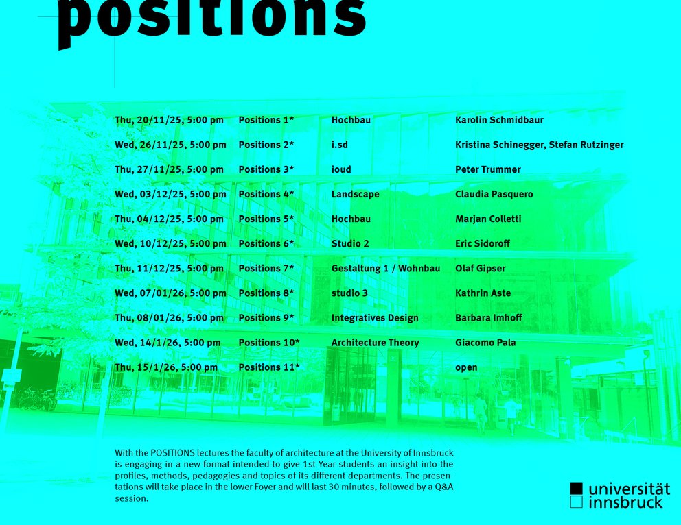 With the POSITIONS lectures the faculty of architecture at the University of Innsbruck is engaging in a new format intended to give 1st Year students an insight into the profiles, methods, pedagogies and topics of its different departments. The presentations will take place in the lower Foyer and will last 30 minutes, followed by a Q&A session.