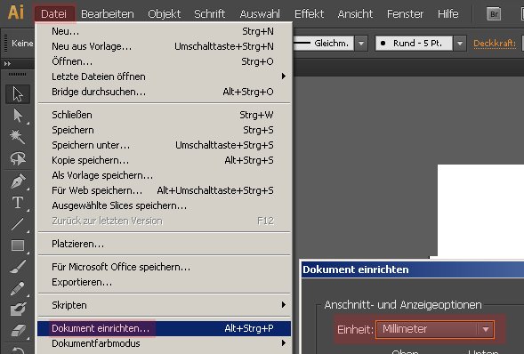 Datei > Dokument einrichten > Einheit: Millimeter > Zeichenfläche bearbeiten