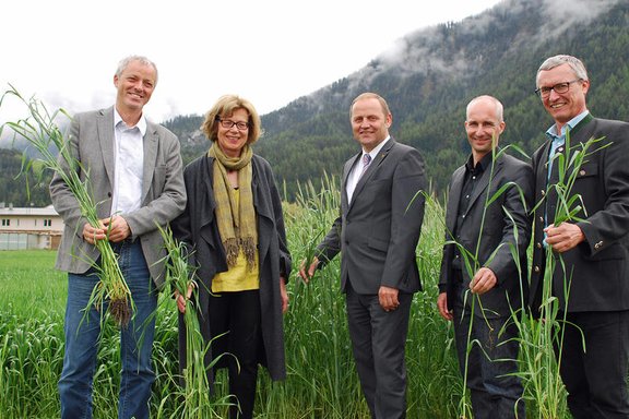 Eröffneten den Forschungsbauernhof Imst: (v.l.) Studiendekan der Fakultät für Biologie Paul Illmer, Ideengeberin Maria Hauser, LHStv Josef Geisler, Michael Traugott vom Forschungszentrum Berglandwirtschaft, Christian Partl vom landwirtschaftlichen Versuchswesen des Landes Tirol (Foto: Land Tirol/Entstrasser-Müller)