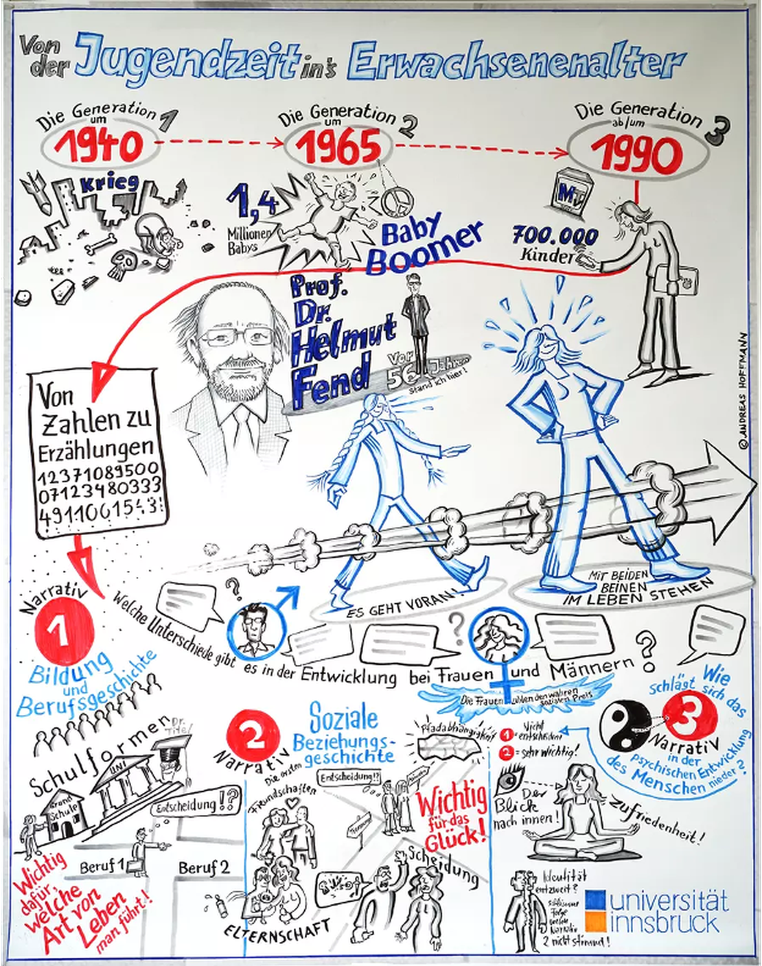 Das Bild zeigt eine farbenfrohe und detaillierte Mindmap mit verschiedenen Illustrationen und Texten, hauptsächlich in Deutsch. Es behandelt generelle Unterschiede zwischen den Generationen und gesellschaftliche Veränderungen im Laufe der Zeit. In der Mitte der Mindmap befindet sich eine Zeitleiste von den 1940er Jahren bis zu den 1990er Jahren. Verschiedene Generationen wie “Baby Boomer” und “Generation X” sind beschriftet. Es gibt Zeichnungen von Menschen, die charakteristische Aktivitäten ihrer Zeit ausüben. Die Mindmap enthält Statistiken, Fragen zu Beziehungen und Glück sowie eine Referenz zur Universität Innsbruck.