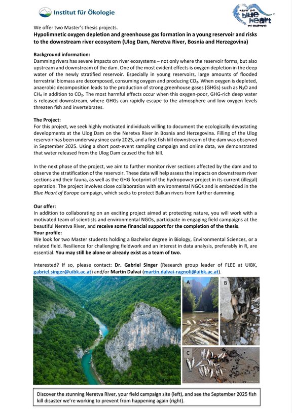 Am Institut für Ökologie werden 2 spannende und finanzierte Masterarbeiten angeboten. Im Fokus steht der Ulog-Stausee an der Neretva in Bosnien und Herzegowina. Untersucht wird die Sauerstoffarmut in tiefen Wasserschichten, die Entstehung von Treibhausgasen und die Folgen für das Ökosystem flussabwärts. Das Projekt verbindet Feldarbeit am Fluss, Datenanalyse und Zusammenarbeit mit Umwelt-NGOs im Rahmen der "Blue Heart of Europe" Kampagne.