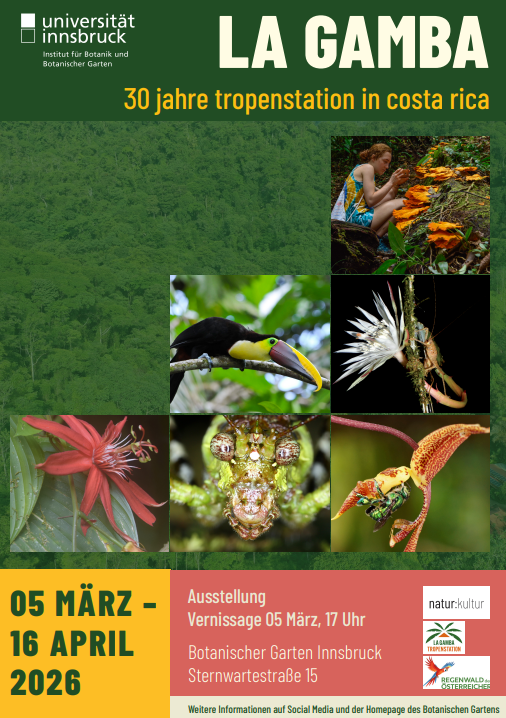 Die Tropenstation La Gamba ist eine Forschungsstation der Universität Wien in der pazifischen Region Costa Ricas. Zahlreiche Forschende und Studierende arbeiten Jahr für Jahr in der Tropenstation und kehren mit neuen Erkenntnissen und beeindruckenden Bildern zurück. Die Foto-Ausstellung präsentiert auf 30 Tafeln Natur und Forschung in den artenreichen Regenwäldern und den angrenzenden Kulturflächen.