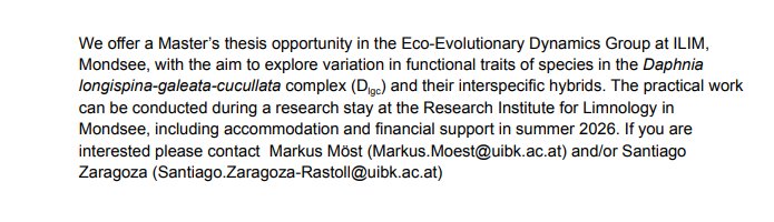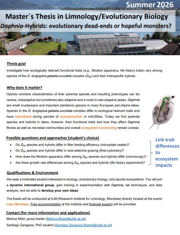 The thesis will be conducted at ILIM (Research Institute for Limnology, Mondsee) directly located at the scenic Lake Mondsee. Free accommodation at the institute and financial support will be provided.