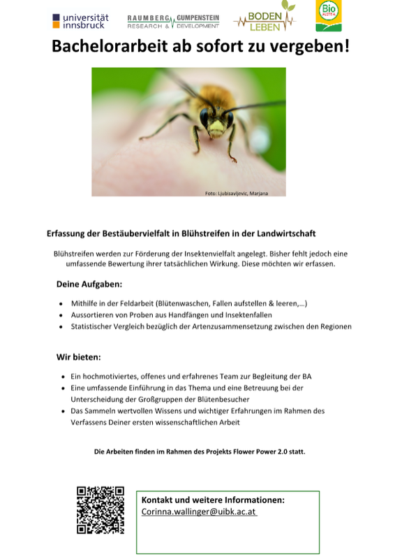 Ab sofort ist eine Bachelorarbeit zur Erfassung der Bestäubervielfalt in landwirtschaftlichen Blühstreifen zu vergeben. Die Arbeit umfasst Feldarbeit (Blütenwaschen, Fallen betreuen), das Aussortieren von Proben sowie statistische Vergleiche der Artenzusammensetzung zwischen Regionen.