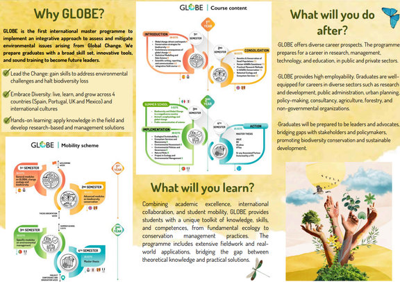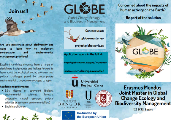 GLOBE is a new Erasmus Mundus Joint Master (EMJM) in Global Change Ecology and Biodiversity Management , delivered by Universidad Rey Juan Carlos, Madrid, Spain together with Bangor University (UK), Universidade de Lisboa (Portugal), and Universidad Autónoma de Tlaxcala (Mexico). EMJMs are the flagship MSc level education programmes of the European Union, emphasizing excellence, internationalization, and mobility. EMJMs aim to enrol academically excellent students across the world, and are supported by a strong scholarships programme, which offers generous stipends of 1400 € / month to approx.