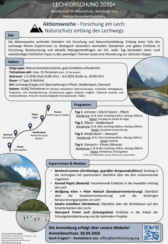 aktuelle Forschungsfragen sowie die Herausforderungen des Naturschutzes im Lechraum kennen. Die Aktionswoche richtet sich an naturwissenschaftlich und naturschutzfachlich Interessierte, die gerne wandern. Die Teilnehmerzahl ist auf 15 Personen begrenzt. Weitere Informationen zu Programm, Kosten und Anmeldung finden Sie im Flyer. Sollten Sie Unterstützung bei der Organisation der An- und Abreise oder zusätzlicher Übernachtungen benötigen, helfen wir Ihnen jederzeit gerne weiter!