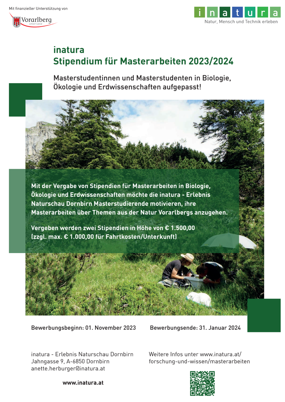 als naturkundliches Kompetenzzentrum und Dokumentationszentrums der Natur Vorarlbergs vergibt die inatura - Erlebnis Naturschau Dornbirn ab sofort zwei Stipendien für Masterarbeiten mit Themen aus der Biologie, Ökologie und Erdwissenschaften und Bezug zur Natur Vorarlbergs.