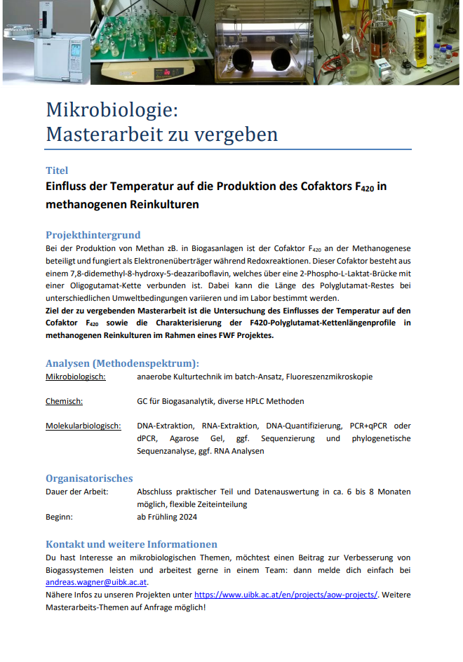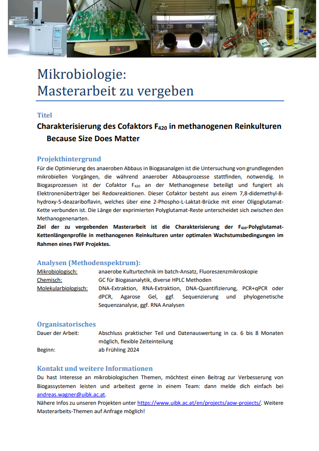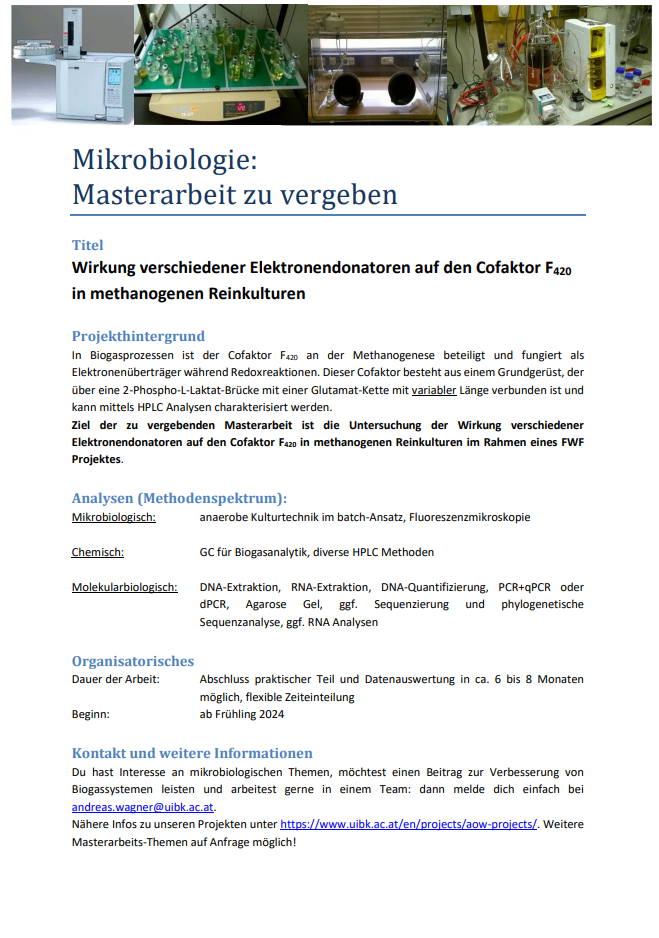 Es stehen 3 Masterarbeiten in der Mikrobiologie bei Prof. Andreas Wagner zur Verfügung. Unter https://www.uibk.ac.at/en/projects/aow-projects/ findet ihr weitere Informationen zum Projekt.