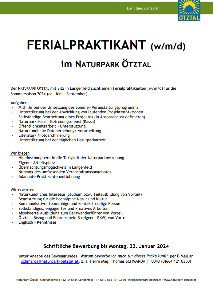 Der Naturpark Ötztal ist wieder auf der Suche nach einem/einer PraktikantIn für den Sommer 2024
