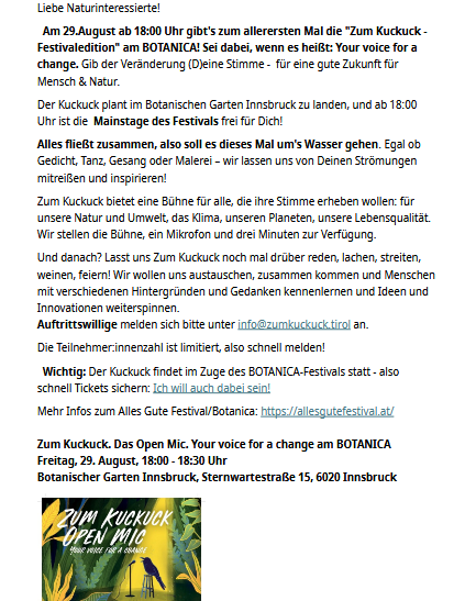 Am 29.August ab 18:00 Uhr gibt's zum allerersten Mal die "Zum Kuckuck - Festivaledition" am BOTANICA!.Zum Kuckuck bietet eine Bühne für alle, die ihre Stimme erheben wollen: für unsere Natur und Umwelt, das Klima, unseren Planeten, unsere Lebensqualität. Wir stellen die Bühne, ein Mikrofon und drei Minuten zur Verfügung.