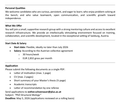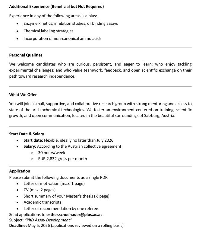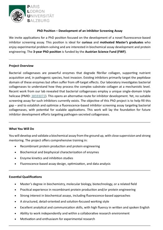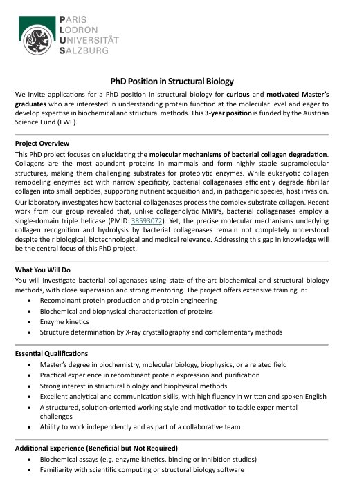 Es startet ein FWF gefördertes Forschungsprojekt im Fachbereich Biowissenschaften und Medizinische Biologie in Salzburg. Dafür werden zwei talentierte und motivierte PhD‑Studierende gesucht. Bewerbungen von Master‑Studierenden kurz vor dem Abschluss sowie von kürzlich graduierten Master‑Absolvent*innen sind sehr willkommen. Bei Interesse bitte bei Esther Schöner melden. (Email: esther.schoenauer@plus.ac.at)