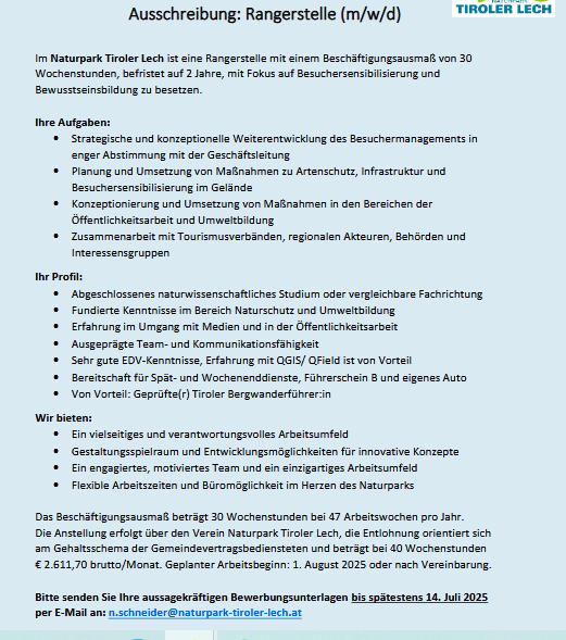 Im Naturpark Tiroler Lech wird eine Rangerstelle frei. Das Beschäftigungsausmaß beträgt 30 Wochenstunden und die Stelle ist befristet auf 2 Jahre. Die Einreichung von Berwerbungen ist möglich bis zum 14.07.2025. Link zur Jobanzeige https://www.naturpark-tiroler-lech.at/jobs/