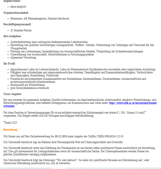 Auf der Pharmakognosie/ dem Institut für Pharmazie wird eine Laboranten-Stelle (20 Std.) nachbesetzt. Onlinebewerbungen sind bis zum 30.12.2025 möglich.