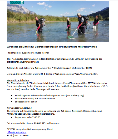 Es werden studentische Mitarbeiter/-innen zur Unterstützung für Elektrobefischungen gesucht. Dabei werden ausgewählte Flüsse in Tirol befischt. Der Tätigkeitszeitraum wäre von August bis Dezember, wobei auch einzelne Tage/Wochen möglich sind.