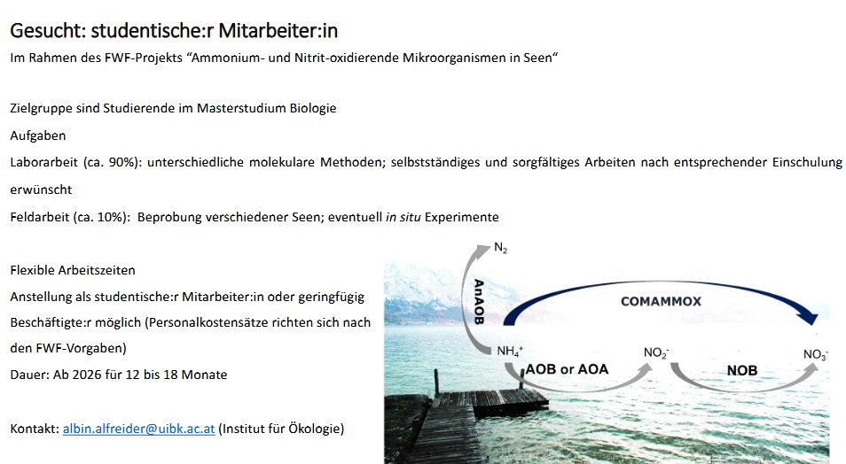 Am Institut für Ökologie wird ein/e studentische/r Mitarbeiter/in (bevorzugt Studierende im Masterstudium Biologie) gesucht. Die Tätigkeit umfasst überwiegend Laborarbeit sowie gelegentliche Feldarbeit und läuft ab 2026 für 12 bis 18 Monate.