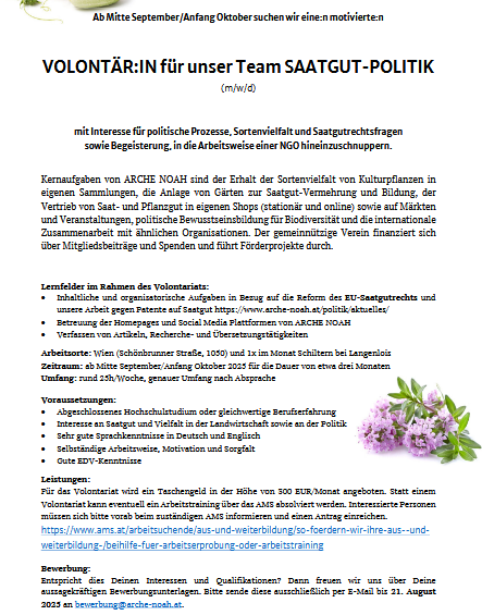 Stellenausschreibung: VOLONTÄR:IN für SAATGUT-POLITIK