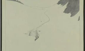 Die schlichte, gelungen einprägsame Zeichnung zieht uns in den Raum hinein, sie hat Höhe, Breite und Tiefe. Die Tiefe, der Raum nach hinten, ergibt sich vor allem mit der Fußspur, die winzig am Horizont beginnt und auf die Betrachterin, den Betrachter zuläuft. Tiefe allerdings auch ganz umgangssprachlich als Gegenteil von Höhe – die Stapfen enden in einer Gletscherspalte, die sich unvermutet inmitten der ansonsten völlig unberührten Schneelandschaft aufgetan hat. Die Perspektive auf das Geschehen ist zentral, aber weder frontal, noch von einem Scheitelpunkt aus, sondern von schräg vorne. Aber es deutet nichts darauf hin, dass eine Betrachterin, ein Betrachter erhöht, auf einem der Berge stehen könnte, die das Schneetal säumen: Wir müssten herabrutschen, denn es ist nichts zu sehen, was irgendwie Halt geben könnte. Man wird unsicher, schwebt im Raum. Und in der Zeit: Ist das stapfende Wesen, das sich auf uns zubewegte, bewusst vor uns zur Seite abgebogen und haben wir also seinen Absturz gesehen? Oder hat sein Weg gar nicht mit uns zu tun, blicken wir von unserem nicht viel deutlicher definierbaren Ort auf ein Rätsel? Es scheint kein dramatischer Vorgang stattgefunden zu haben, es gibt keine Schleifspuren, keine Spuren des Greifens nach vermeintlichem Halt. Als habe sich in dieser Einsamkeit einfach das Schicksal erfüllt.
