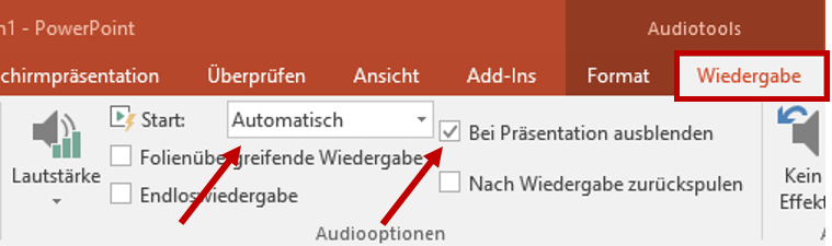 In der Gruppe "Audiooptionen" sollte "Start - Automatisch" ausgewählt sein und "Bei Präsentation ausblenden" aktiviert sein.