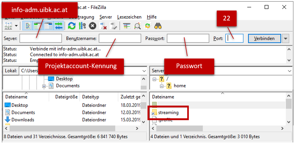 Die Verwaltung der AV-Dateien am Streaming Server kann von jedem Uni-PC, Mitarbeiter/innen-PC oder Privat-PC aus erfolgen. Sie müssen sich lediglich mit einer SSH-Software am Server anmelden. Ein freies Programm dafür ist zum Beispiel FileZilla.