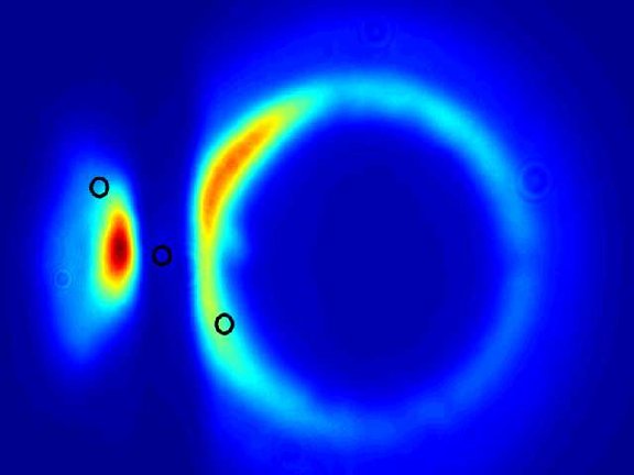 Parametric scattering is clearly visible as a figure-8 shaped emission pattern (of which the left side is cut off for the most part). We were able to verify enhanced cross- and autocorrelation of the photons emitted in a pair of signal and ider modes. The microcavity for these measurements comes from our collaborator Prof. Wolfgang Langbein (U. Cardiff, UK).